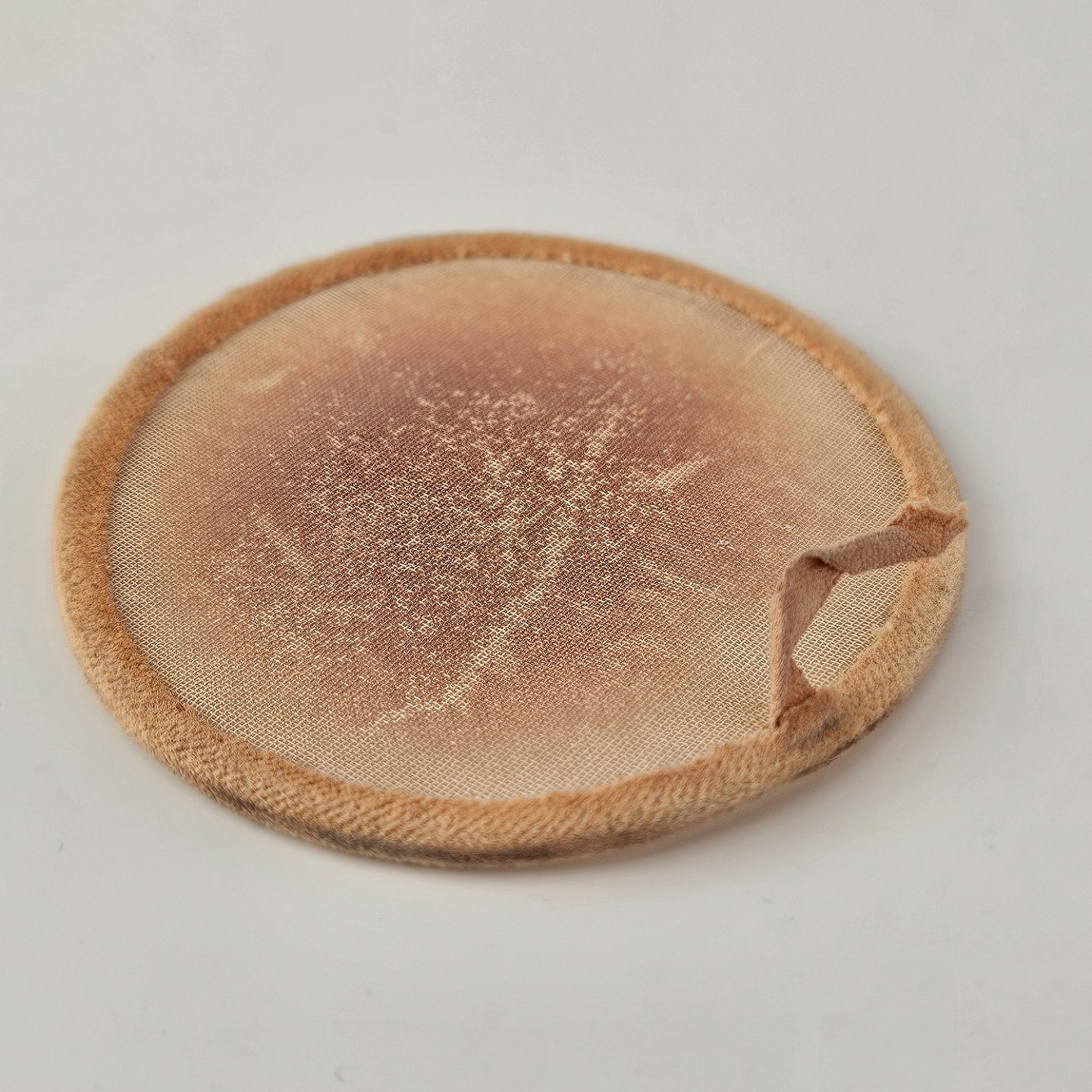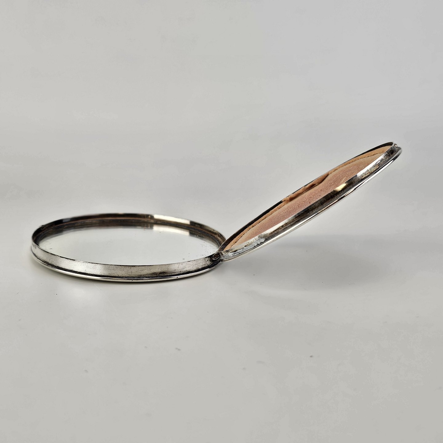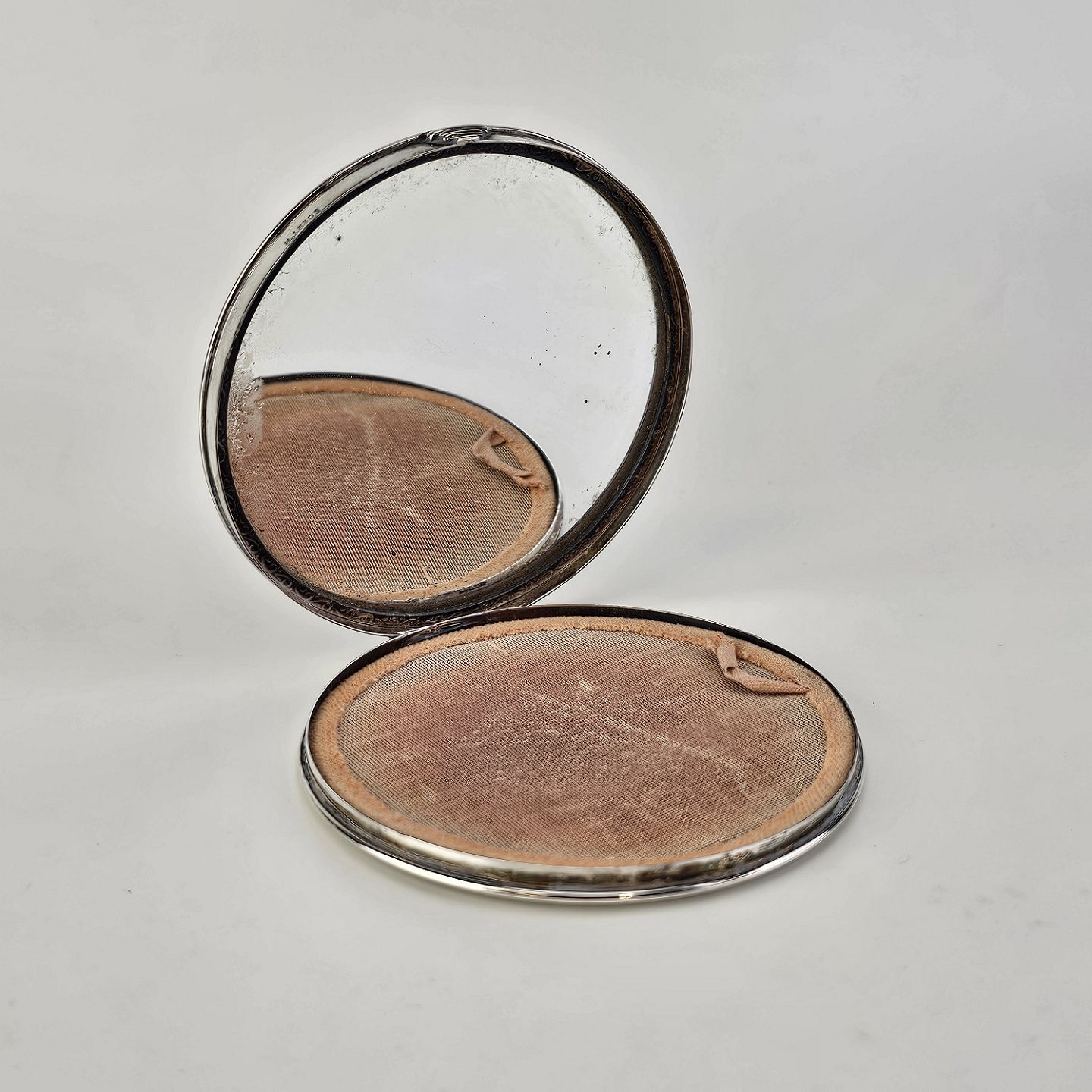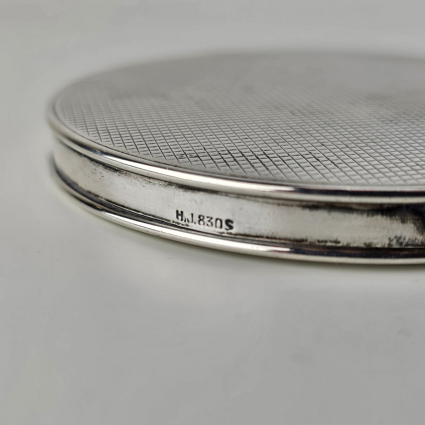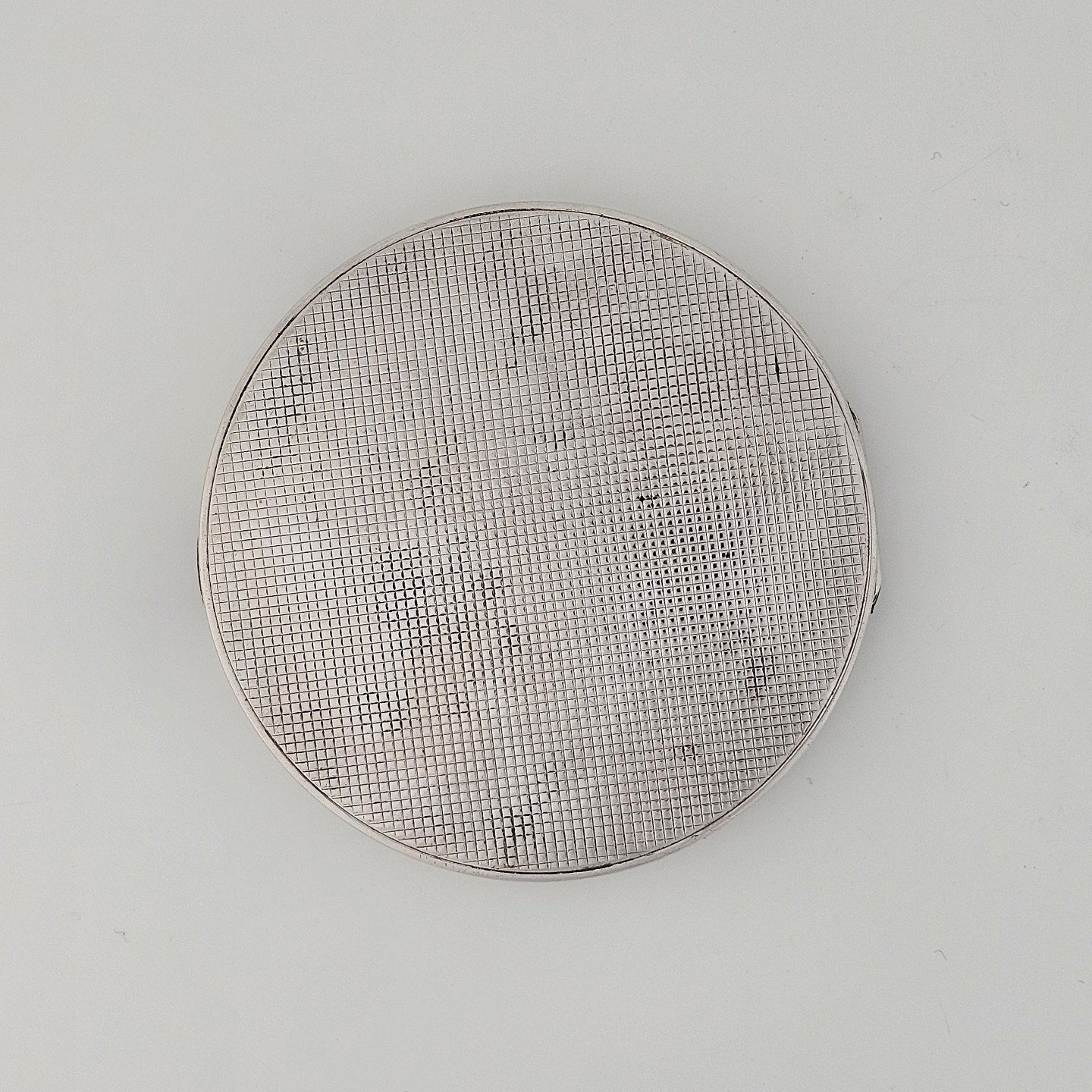 Rund pudderdåse med spejl i sterling sølv med monogram på bundenProducent Hans Jensen & Co.