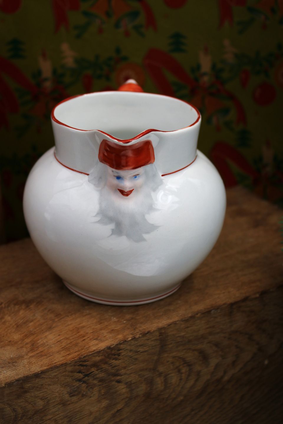 Gammel svensk julekande i fajance med nisser på hældetuden og på hanken. H:12m. Dia.: 13,5cm.Jule kanden er fra Rörstrand fajance fabrik.