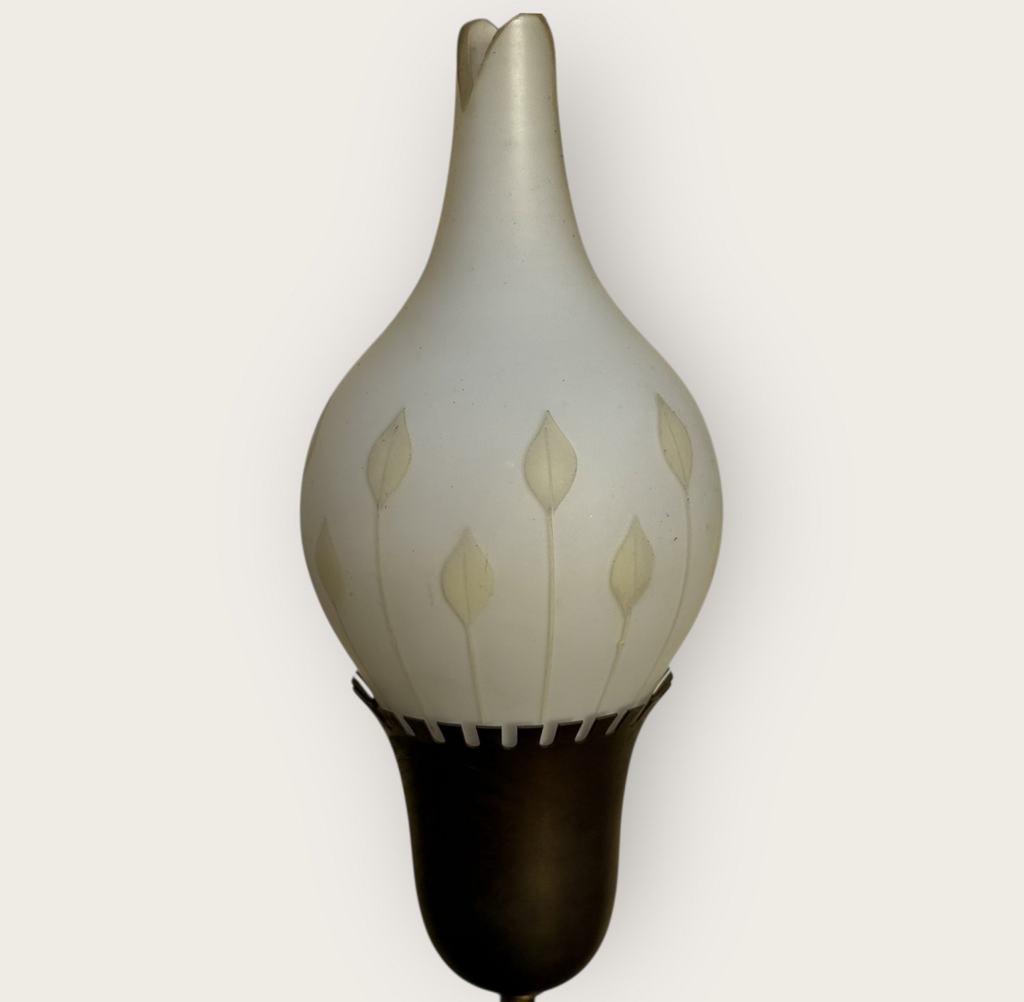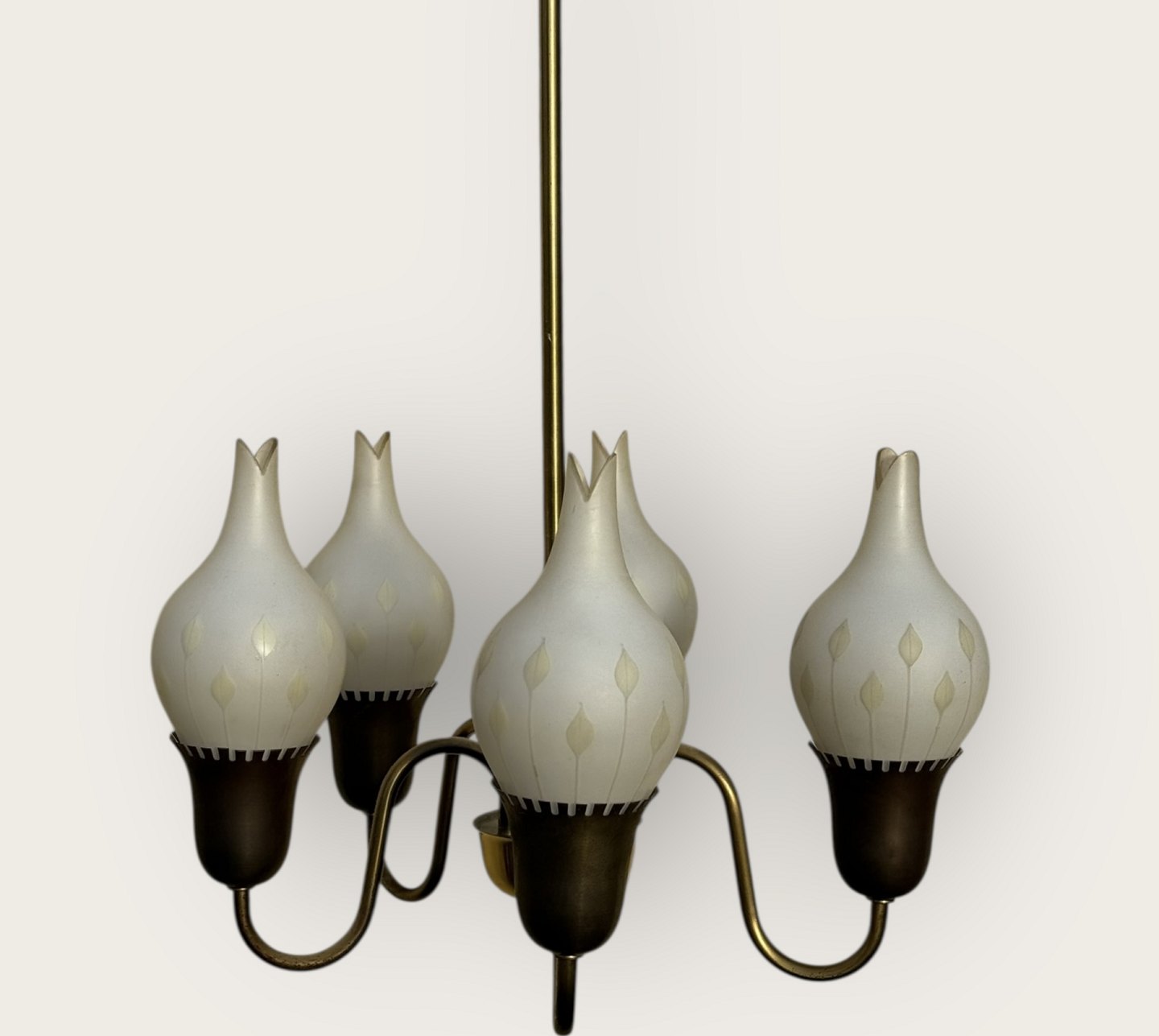 Lysekrone i messing med glasskærme, 5 store skærme i tulipan form, Sandsynligvis fremstillet hos Fog og Mørup, hver skærm er ca. 20cm høj og 10cm i diameter, selve lampen er 42cm i diameter og 67cm høj *Flot stand*Lager: 1