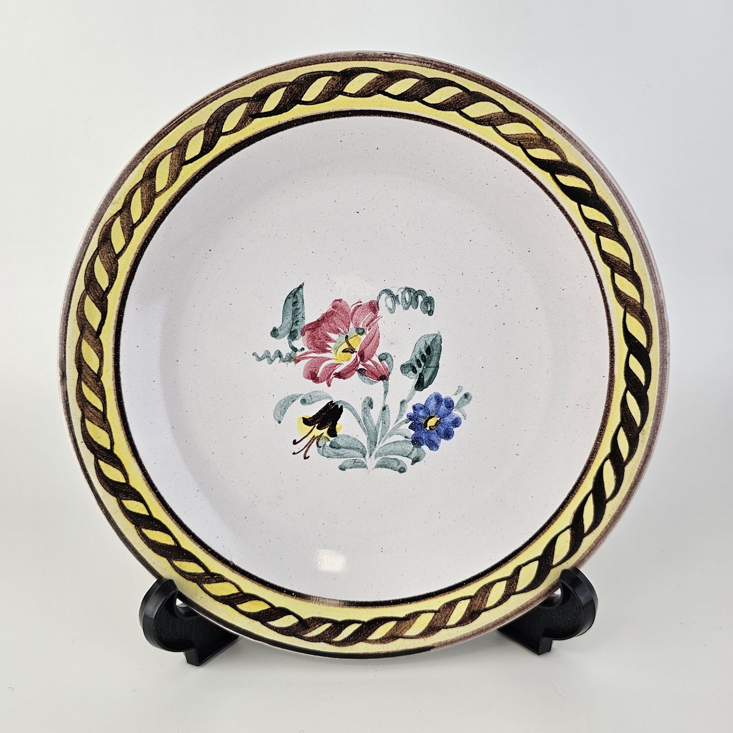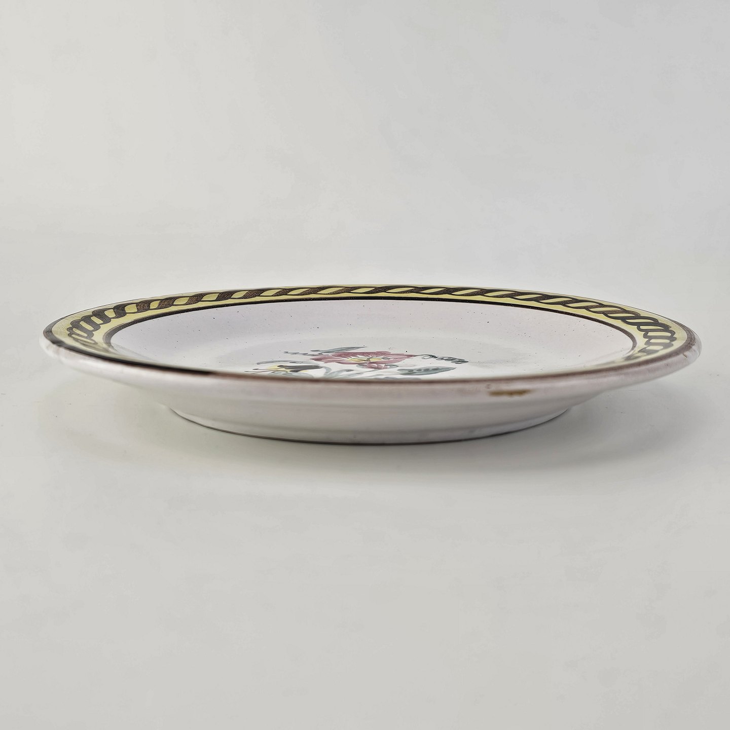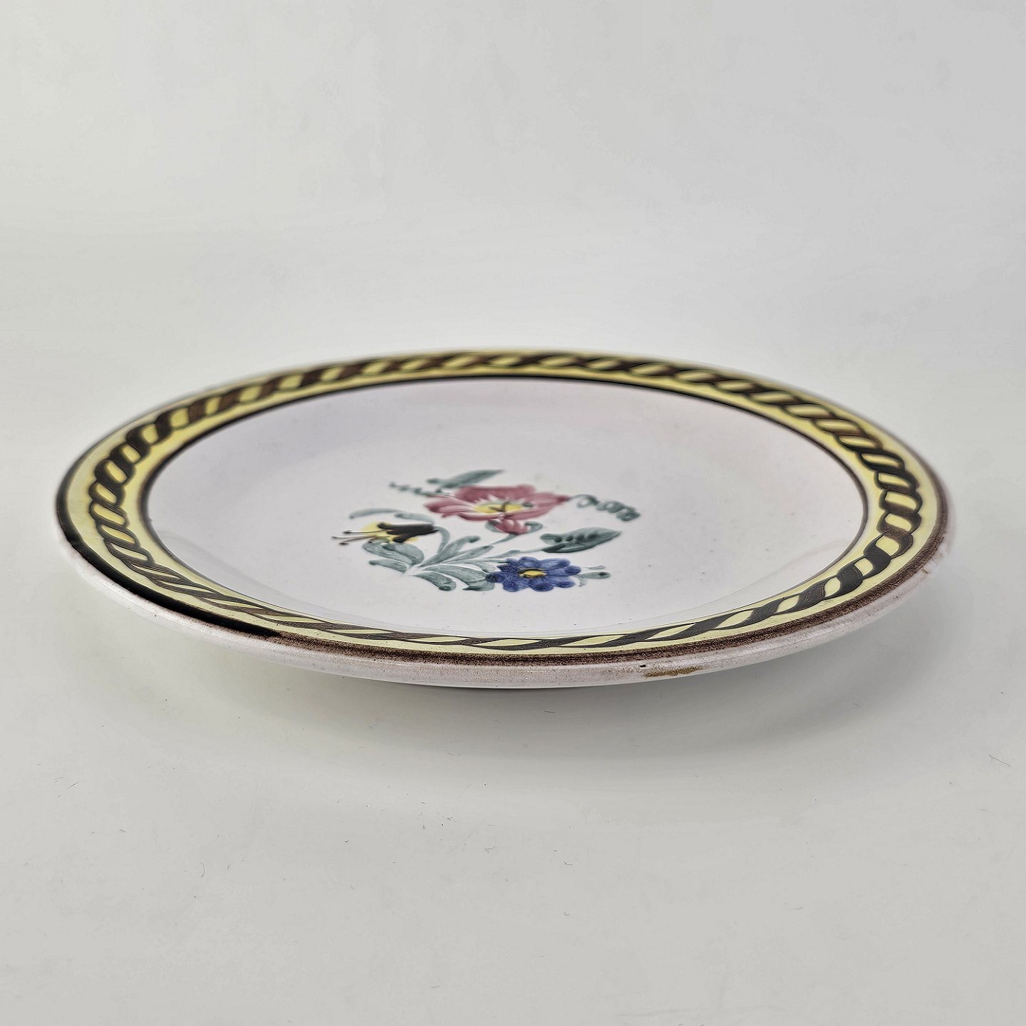 Desserttallerken i keramik med gule detaljer og blomsterdekorationProducent Lars Syberg keramik