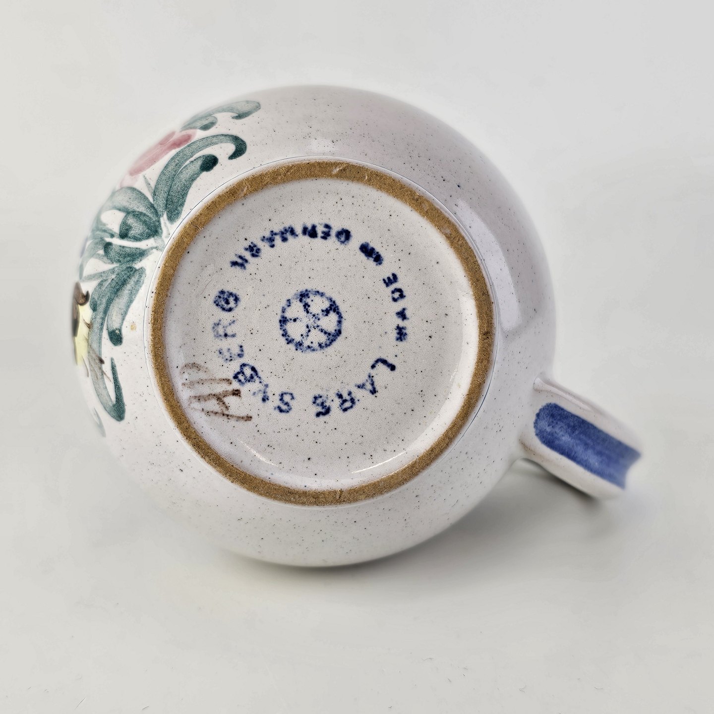 Flødekande i keramik med blå detaljer og blomsterdekorationProducent Lars Syberg keramik