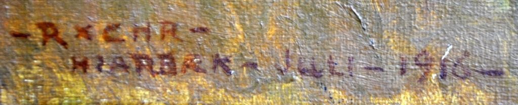 Christiansen, Rasmus (1863 - 1940) Danmark: Landskab ved Hjarbæk, 1916. Olie på lærred. Signeret: RxCHR - Hjarbæk - juli - 1916. H: 56 cm. B: 106 cm.Indrammet: H: 70 cm. B: 86 cm.