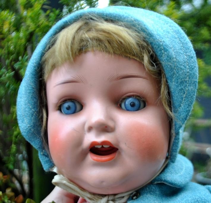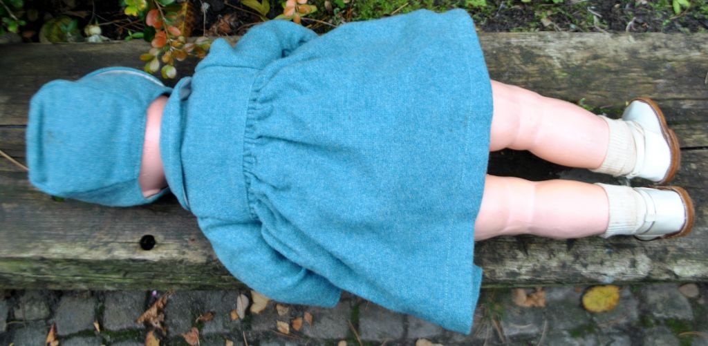Large Heubach - Köppelsdorf doll 342.4 1/2, 20th century. Germany. Stamped. Head and body of composite material. Blue eyes that can open and close, with lashes of hair. Clothes in wool and shoes in patent leather and leather soles. L: 60 cm.NB: the arms are loose