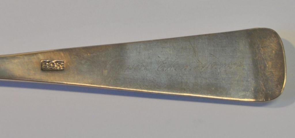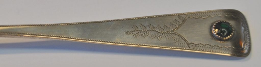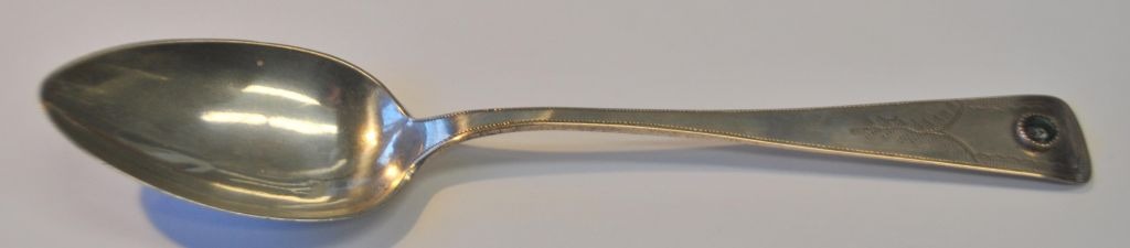 Peter Johannesen Petersen (1805 - 1873) Aabenraa, Danmark: Sølvske med grøn glasflus. Stemplet. L.: 23 cm. Med graveringer på skaft. Med gravering: J. Jepsen, Eken den 9.9.1897.Emne nummer: 28760