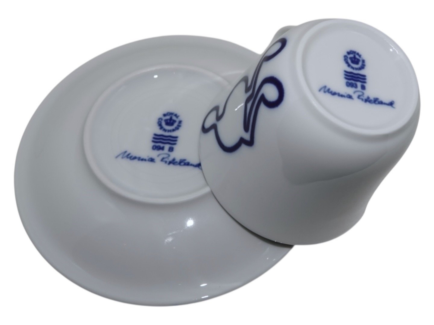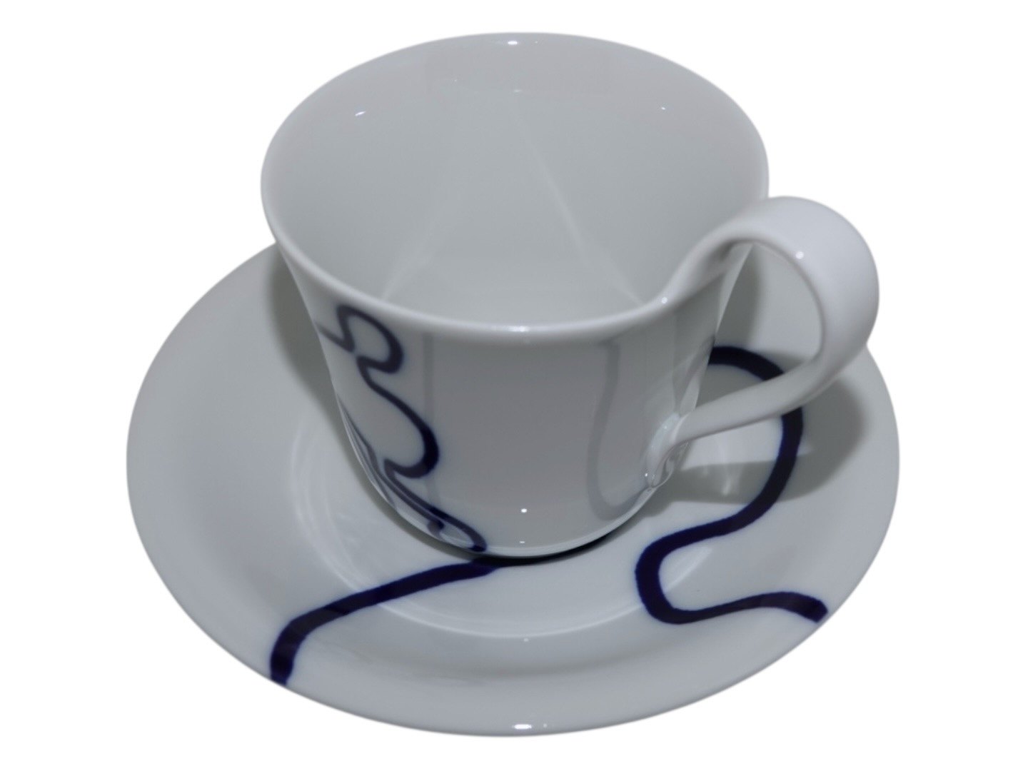 Royal Copenhagen Musica, højhankskop med tilhørende underkop. Dekoration B.Dekorationsnummer 093B (kop) og 094B (underkop).