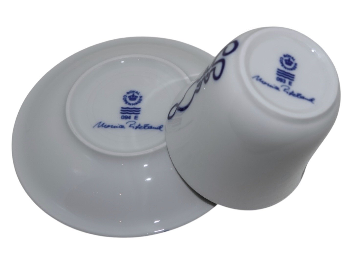 Royal Copenhagen Musica, højhankskop med tilhørende underkop. Dekoration E.Dekorationsnummer 093E (kop) og 094E (underkop).