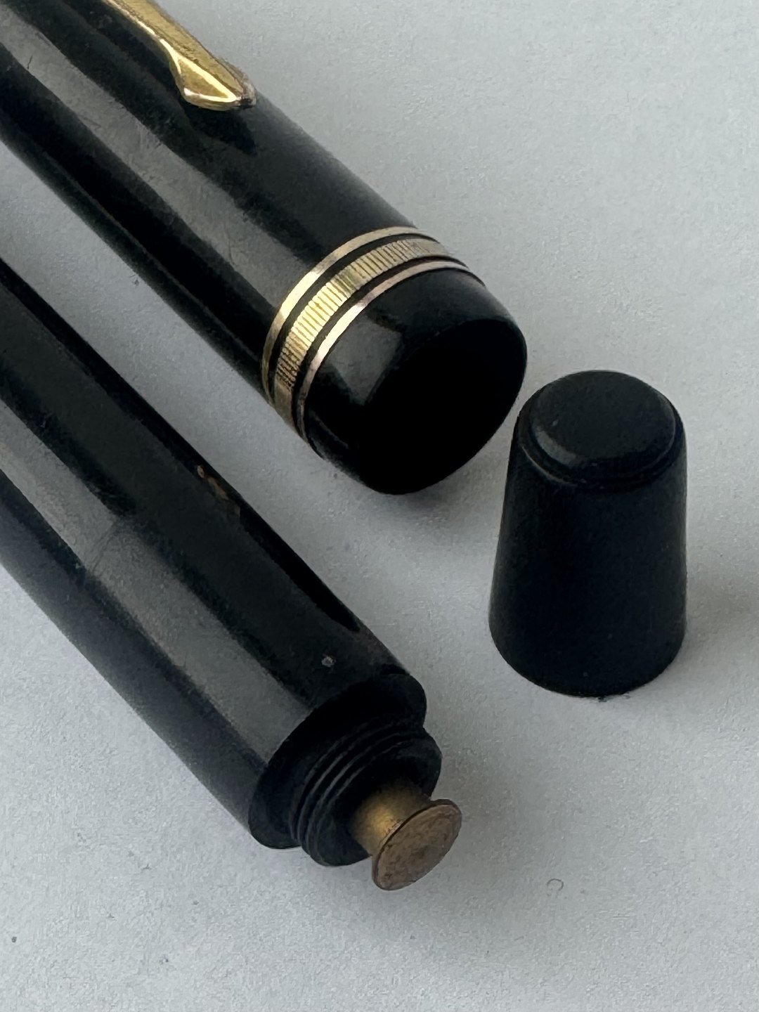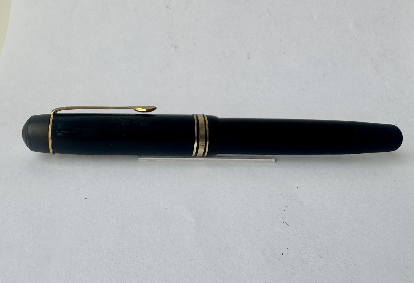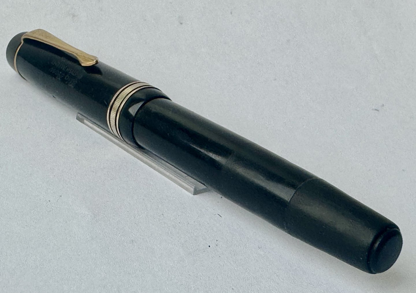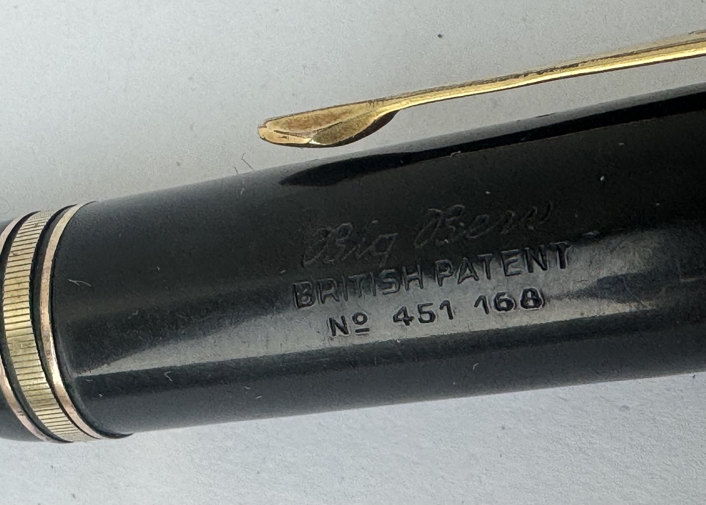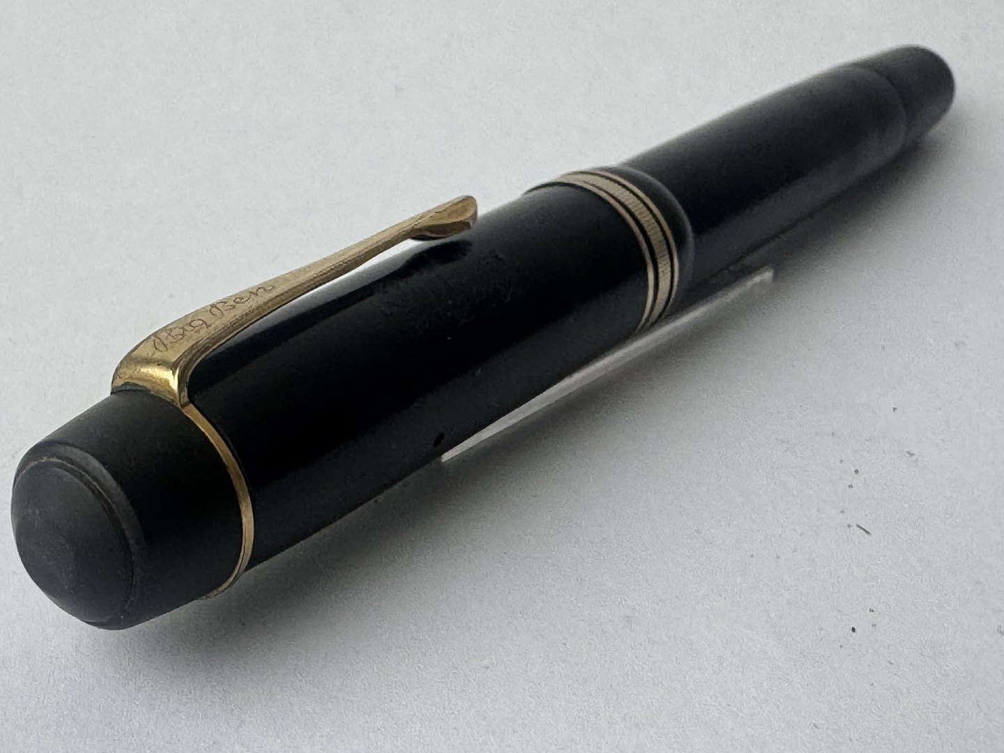 Stor sort Big Ben no. 8 fyldepen med push button filler. Fremstår i god stand uden skader eller reparationer. Alle dele originale BB dele inklusiv en kæmpe guldspids i 14 karat. Der skal indsættes ny gummisæk så pennen igen kan optage blæk og skrive igen. Fyldepennen måler 13,7 cm i længde og hættens åbningsdismeter er 1,3 cm.Ny gummisæk kan indsættes for et tillæg i prisen på kr. 200,-