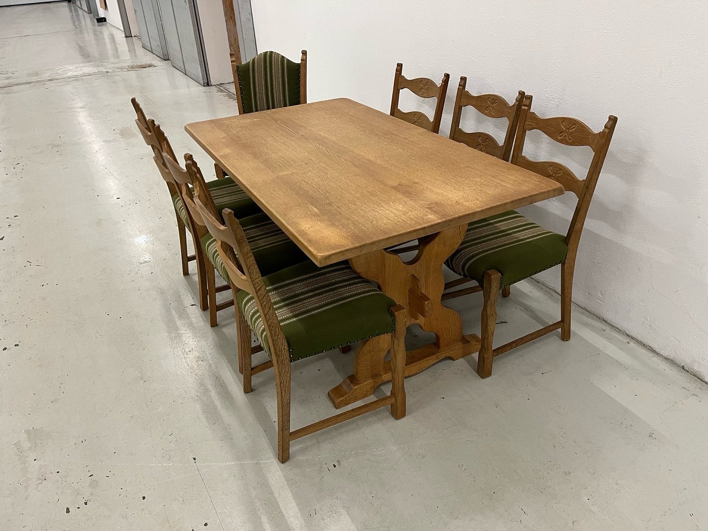 Klassisk spisebordssæt i massiv eg af Henry/Henning KjærnulfDette elegante spisebordssæt i massiv eg er designet af Henry/Henning Kjærnulf og fremstår som et smukt eksempel på dansk møbeldesign fra 1960’erne. Sættet har haft samme ejer siden 1967 og er bevaret i særdeles flot stand med kun få, naturlige brugsspor ingen dyr eller røg.
