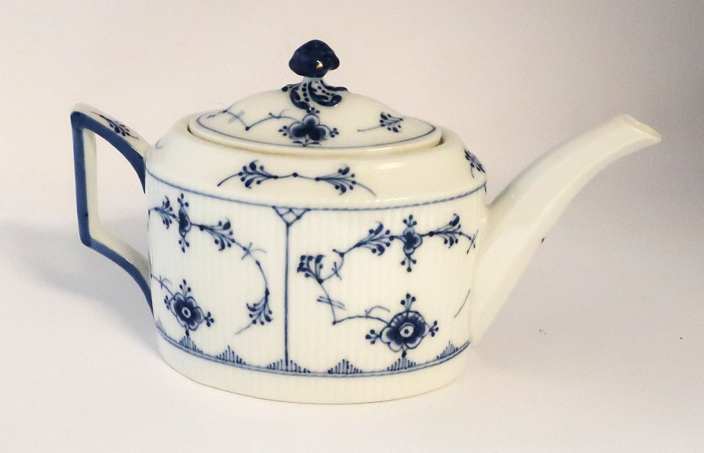 Royal Copenhagen. Musselmalet, riflet. Tekande. Model 253. Højde 13 cm. Længde 22 cm. (2 sortering). Produceret før 1923 Udstiller