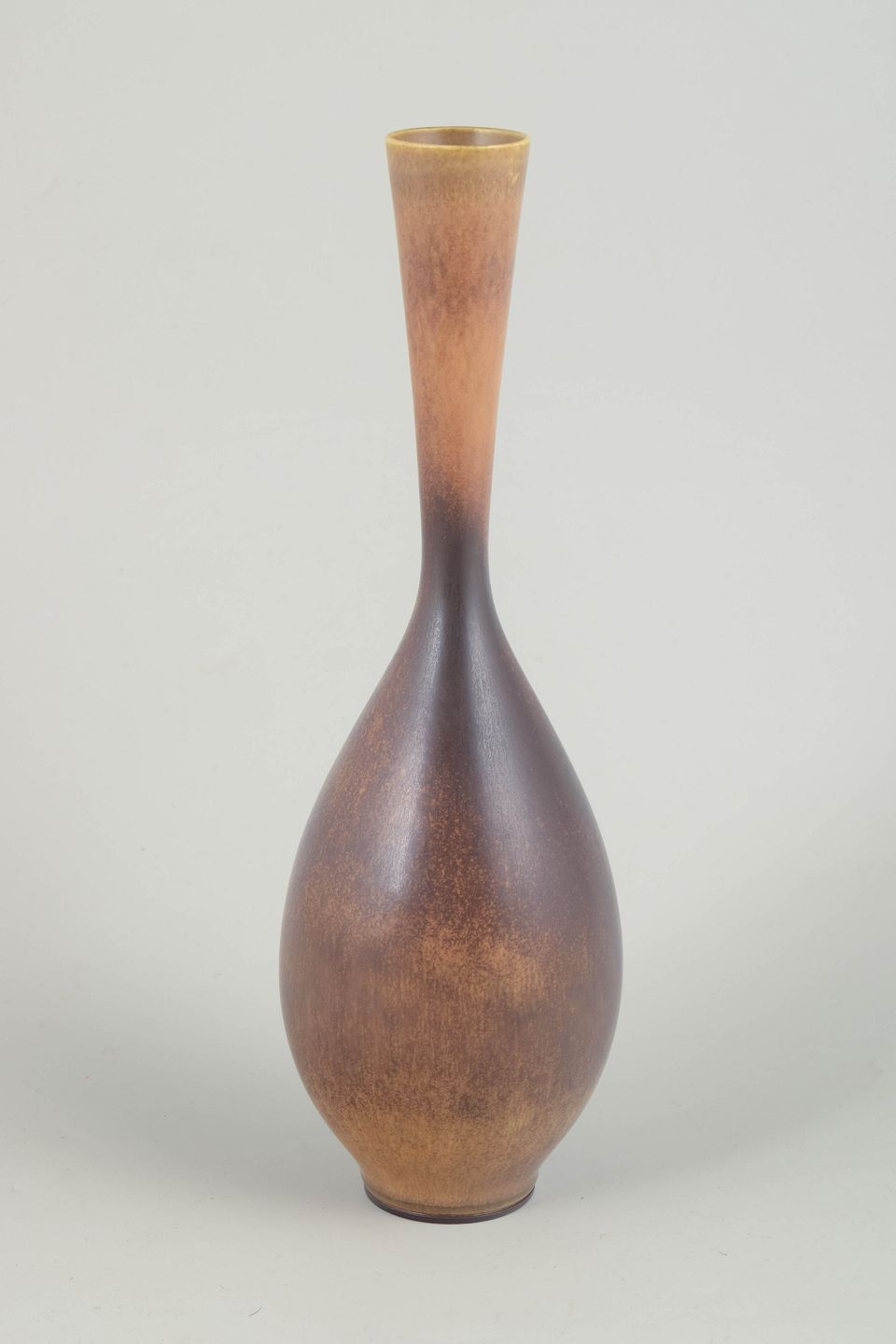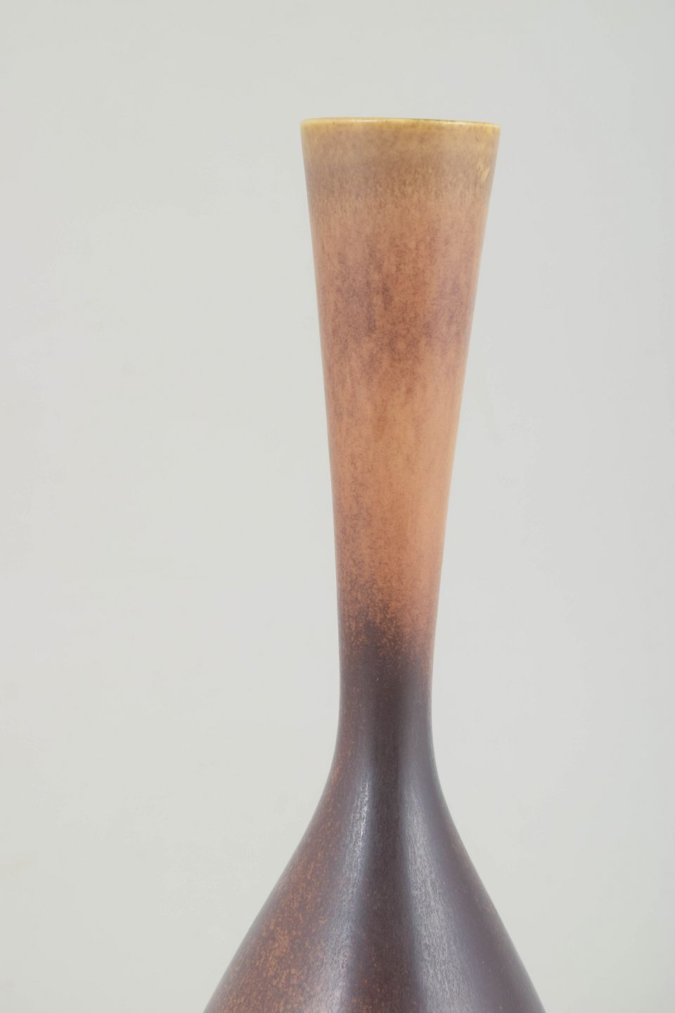 Elegant, slankhalset studio-drejet vase udført i stentøj med karakteristisk, fintharmoniseret glasur i varme brune og violette nuancer. Formen er balanceret og præcist proportioneret, med en blød overgang mellem den pæreformede krop og den lange, smalle hals – et klassisk eksempel på Berndt Fribergs modne arbejder fra Gustavsberg Studio.