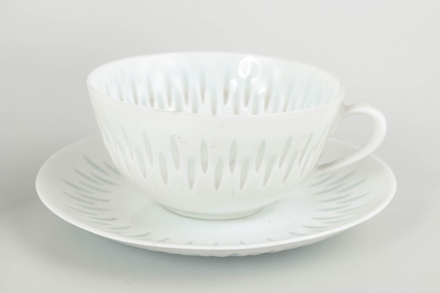 Sæt bestående af fire tekopper med tilhørende underkopper i hvidt porcelæn med gennembrudt “rice porcelain”-dekoration. De aflange perforeringer udfyldt med transparent glasur giver porcelænet et let og næsten translucent udtryk, mens de enkle, afrundede former er karakteristiske for Friedl Holzer-Kjellbergs sene modernistiske porcelænsdesign for Arabia.