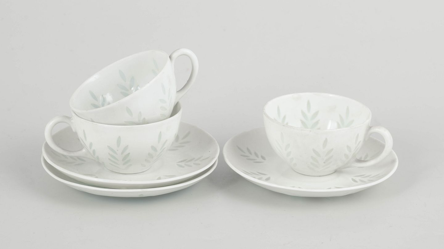 Elegant sæt bestående af tre mokkakopper med tilhørende underkopper i hvidt porcelæn, dekoreret med diskret bladornamentik udført i transparente, let grønligt tonede glasurfelter. Det lette og raffinerede udtryk samt de bløde, harmoniske former er karakteristisk for Friedl Holzer-Kjellbergs sene porcelænsdesign for Arabia.