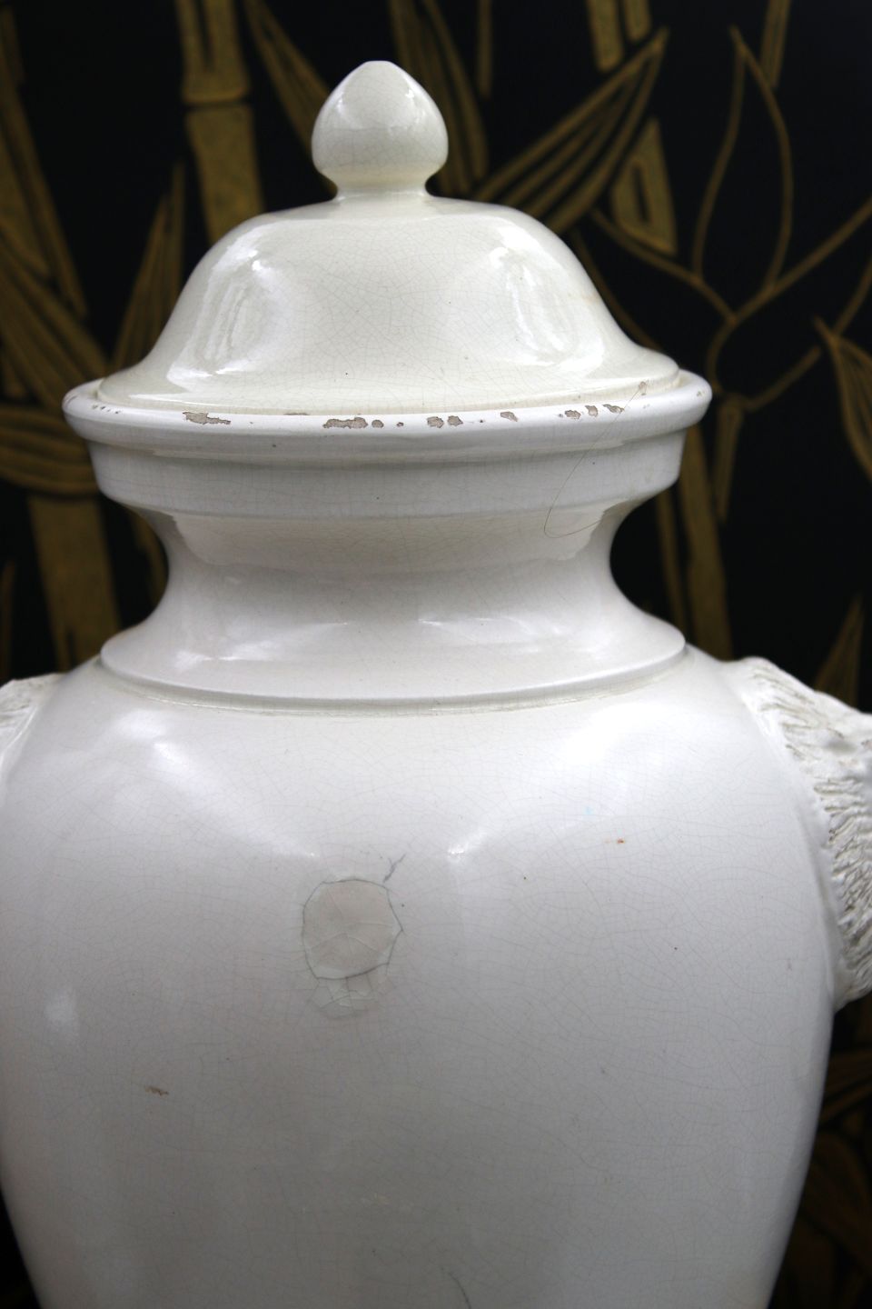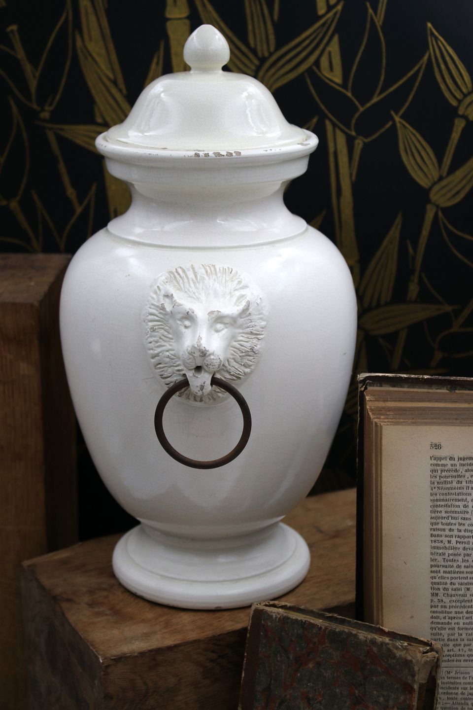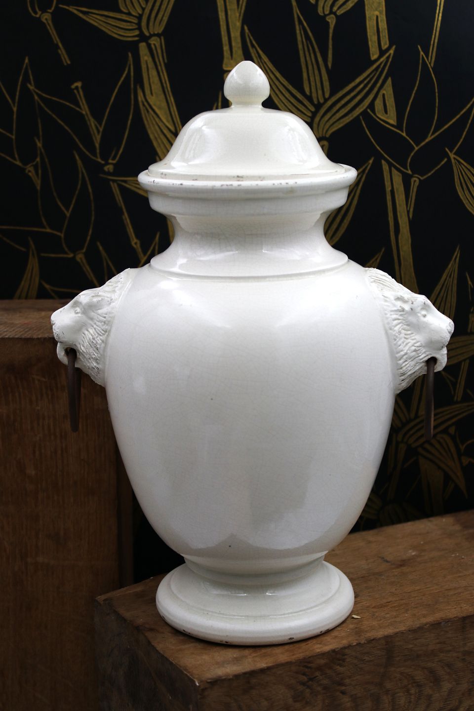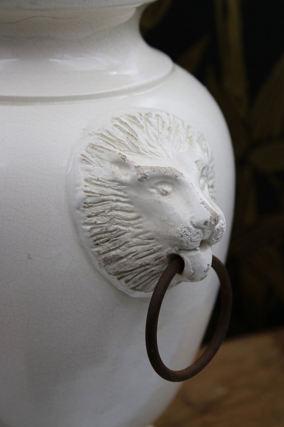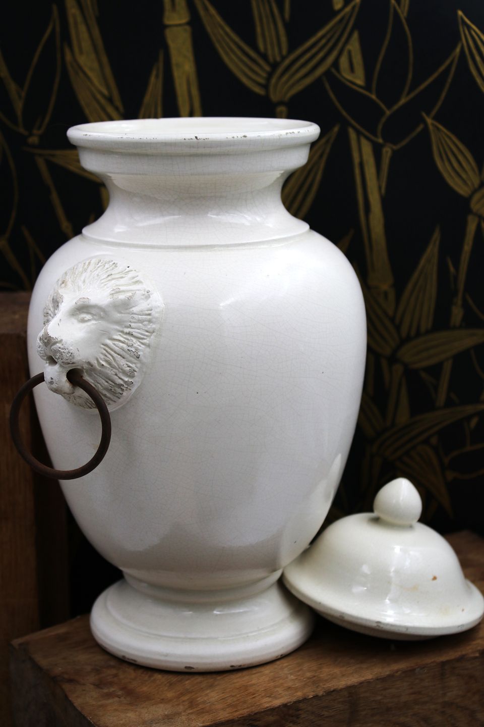 Gammel glaseret stentøjs lågkrukke med løvehoveder på siden.Krukken har en fin gammel patina og måler : H: 32cm.
