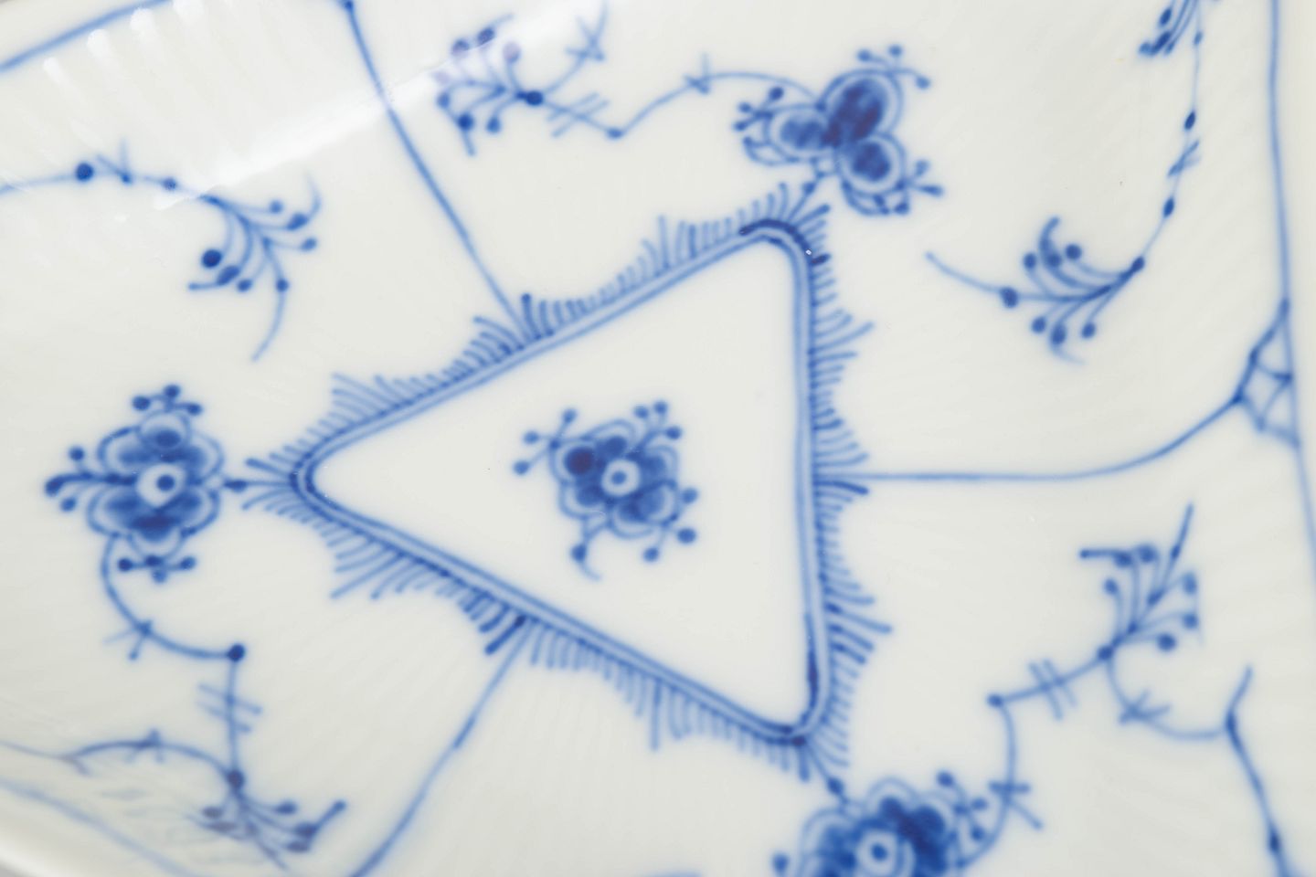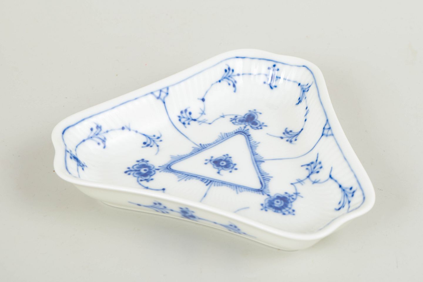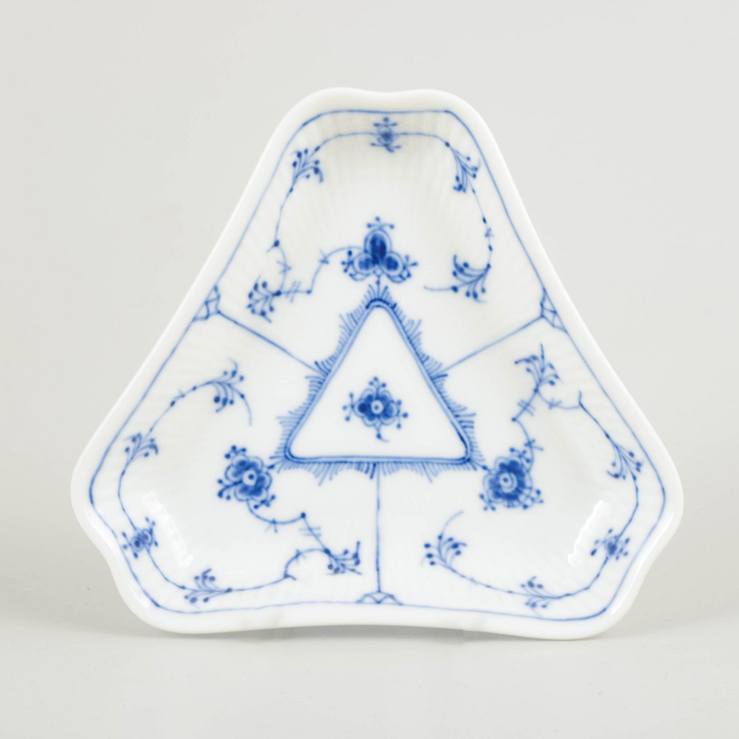 Royal Copenhagen Musselmalet Riflet trekantet asiet, 1960’erne.Dekorativ trekantet asiet i Musselmalet Riflet, udført i riflet form med blødt afrundede hjørner og dekoreret med håndmalet koboltblå underglasur. Asietten har et centralt trekantet spejl omgivet af den klassiske musselmalede dekoration og fremstår som en elegant og relativt sjældent forekommende mindre serveringsdel.