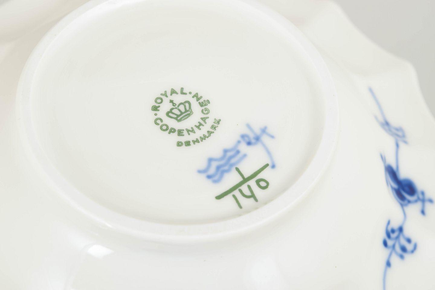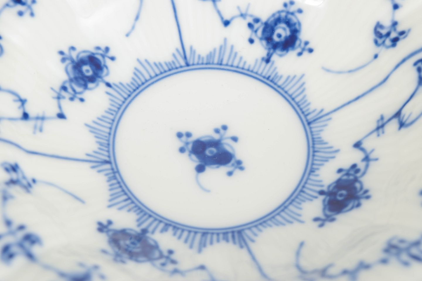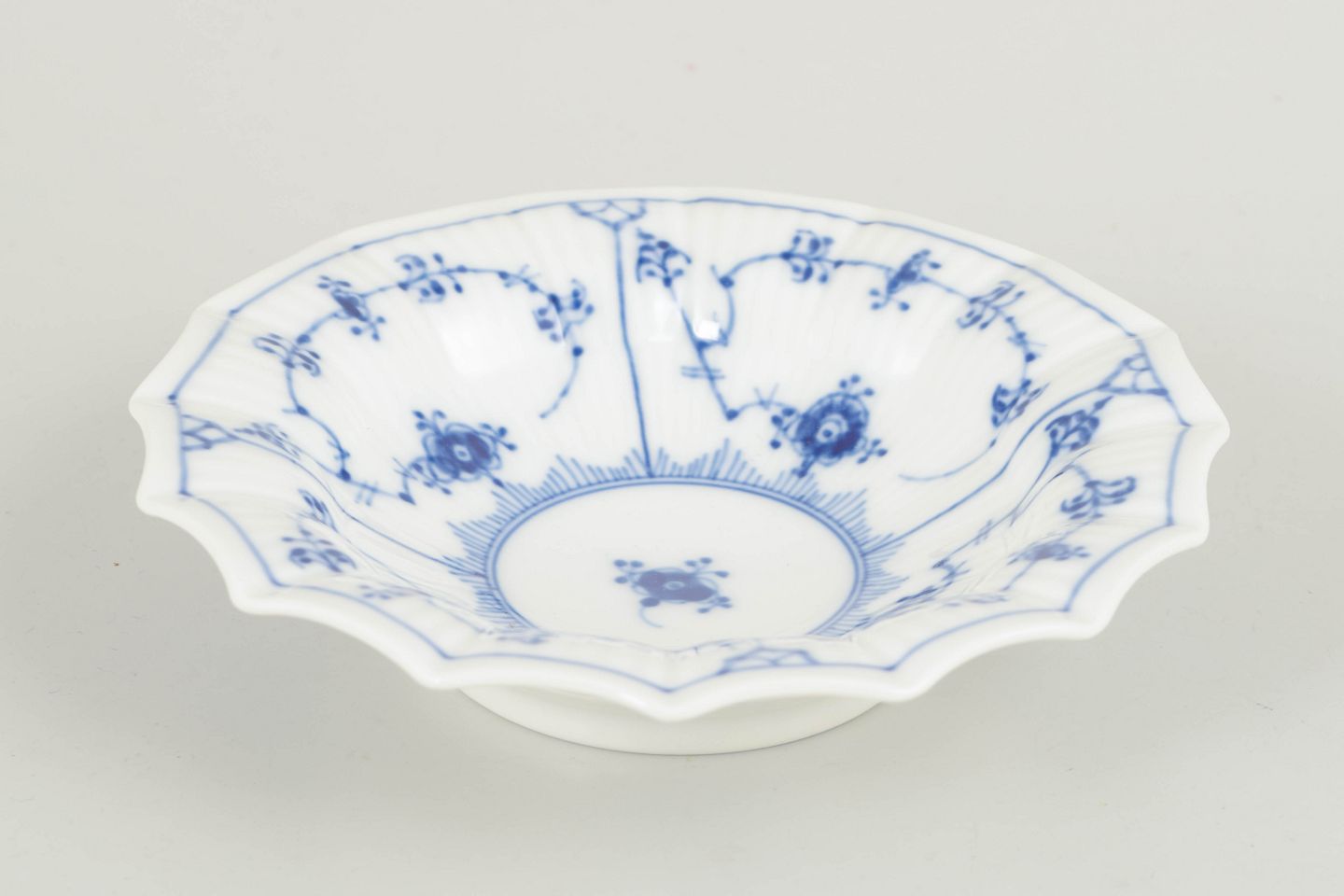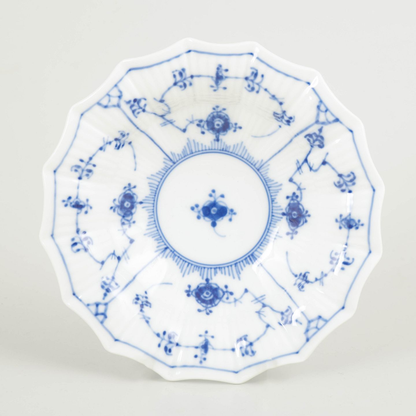 Royal Copenhagen Musselmalet Riflet asiet.Klassisk asiet i Musselmalet Riflet, udført i riflet form med let bølget kant og dekoreret med håndmalet koboltblå underglasur. Asietten har et centralt spejl omgivet af den karakteristiske musselmalede dekoration og fremstår som en elegant mindre del til servering af kage, dessert eller tilbehør.