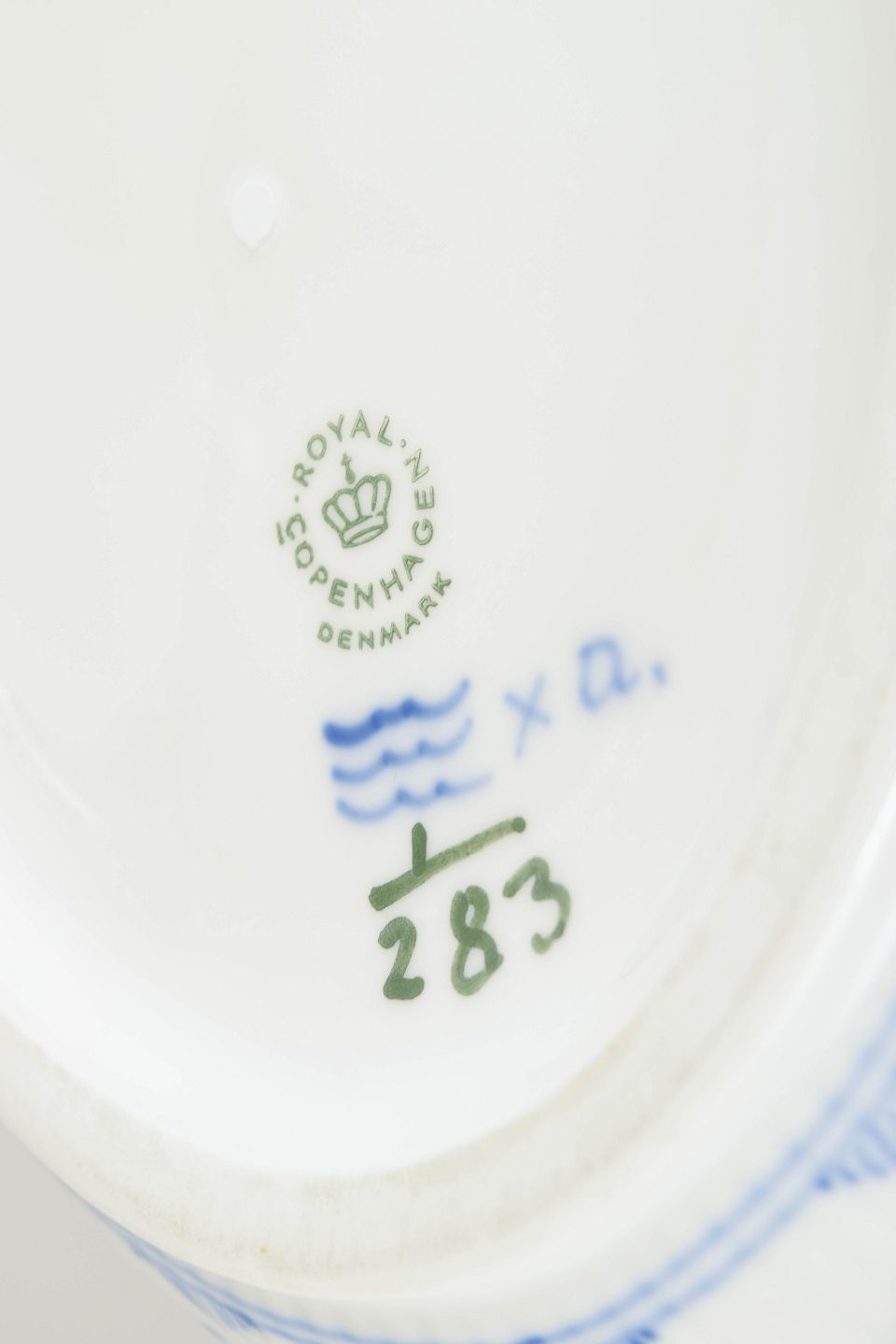 Musselmalet Riflet blev introduceret i 1775 og er Royal Copenhagens ældste og mest traditionsrige stel. Dekorationen er inspireret af kinesisk blå-hvid porcelæn og kendetegnes af sin stringente opbygning, rytmiske penselføring og fine håndmalede detaljer. Terriner har traditionelt haft en central rolle på det dækkede bord og repræsenterer kombinationen af funktionalitet og klassisk æstetik i fabrikkens produktion i midten af det 20. århundrede.