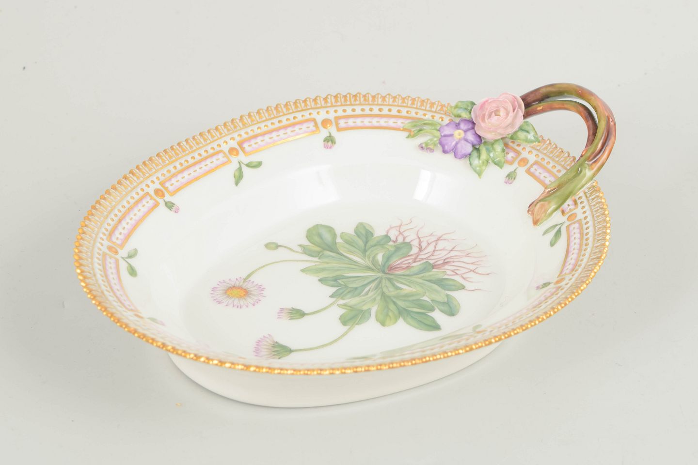 Royal Copenhagen Flora Danica fad med hank, slutningen af 1970’erne.Elegant fad med hank i det ikoniske Flora Danica-stel, håndmalet med botanisk motiv gengivet efter Flora Danica-værket. Fadet er udført i stellets karakteristiske, raffinerede formsprog med dekoreret rand og markant hank, der giver både funktionalitet og et dekorativt udtryk. Velegnet til servering eller præsentation.