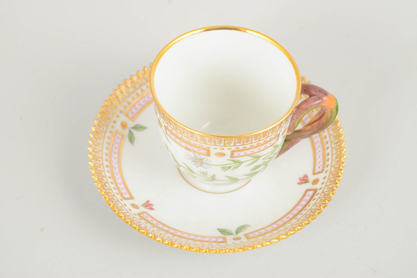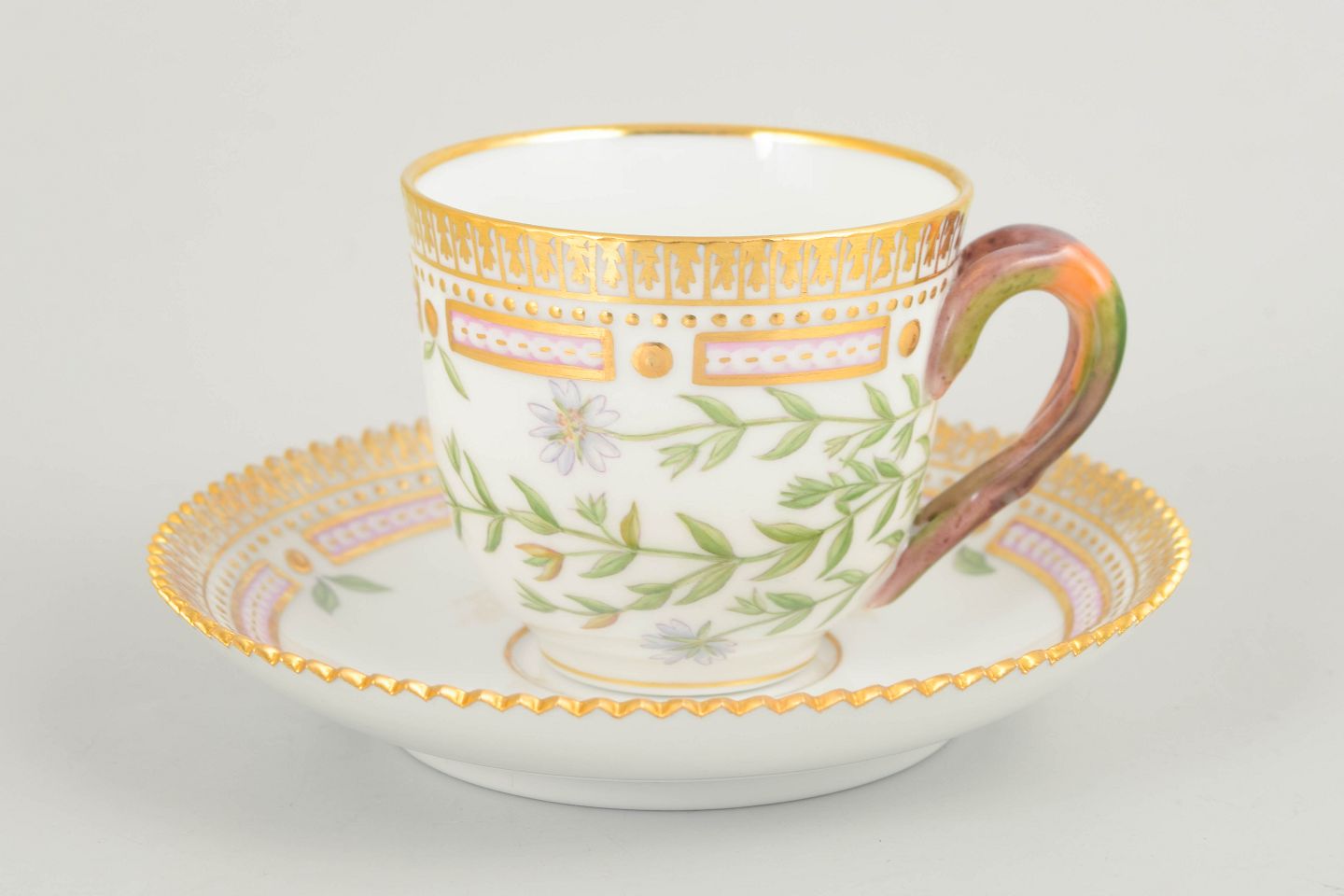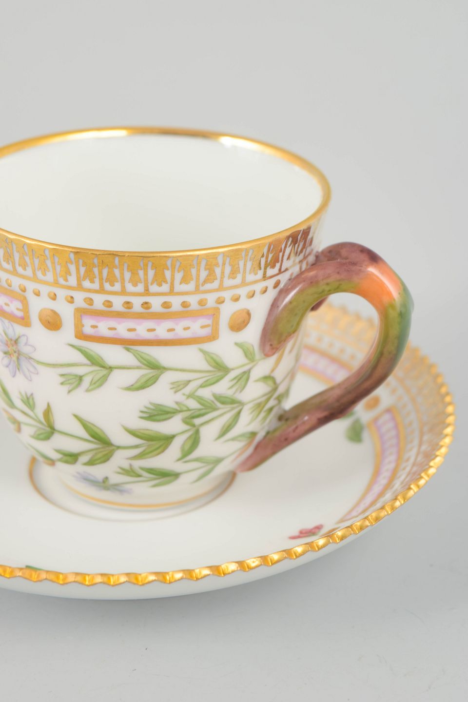 Bio: Flora Danica-stellet blev introduceret i 1790 og regnes blandt Royal Copenhagens mest prestigefyldte produktioner. Dekorationerne er baseret på det monumentale botaniske værk Flora Danica og er kendetegnet ved høj detaljerigdom og fremragende håndværksmæssig kvalitet. Moccakopper var traditionelt anvendt til servering af stærk kaffe og repræsenterer en raffineret del af det klassiske kaffestel.