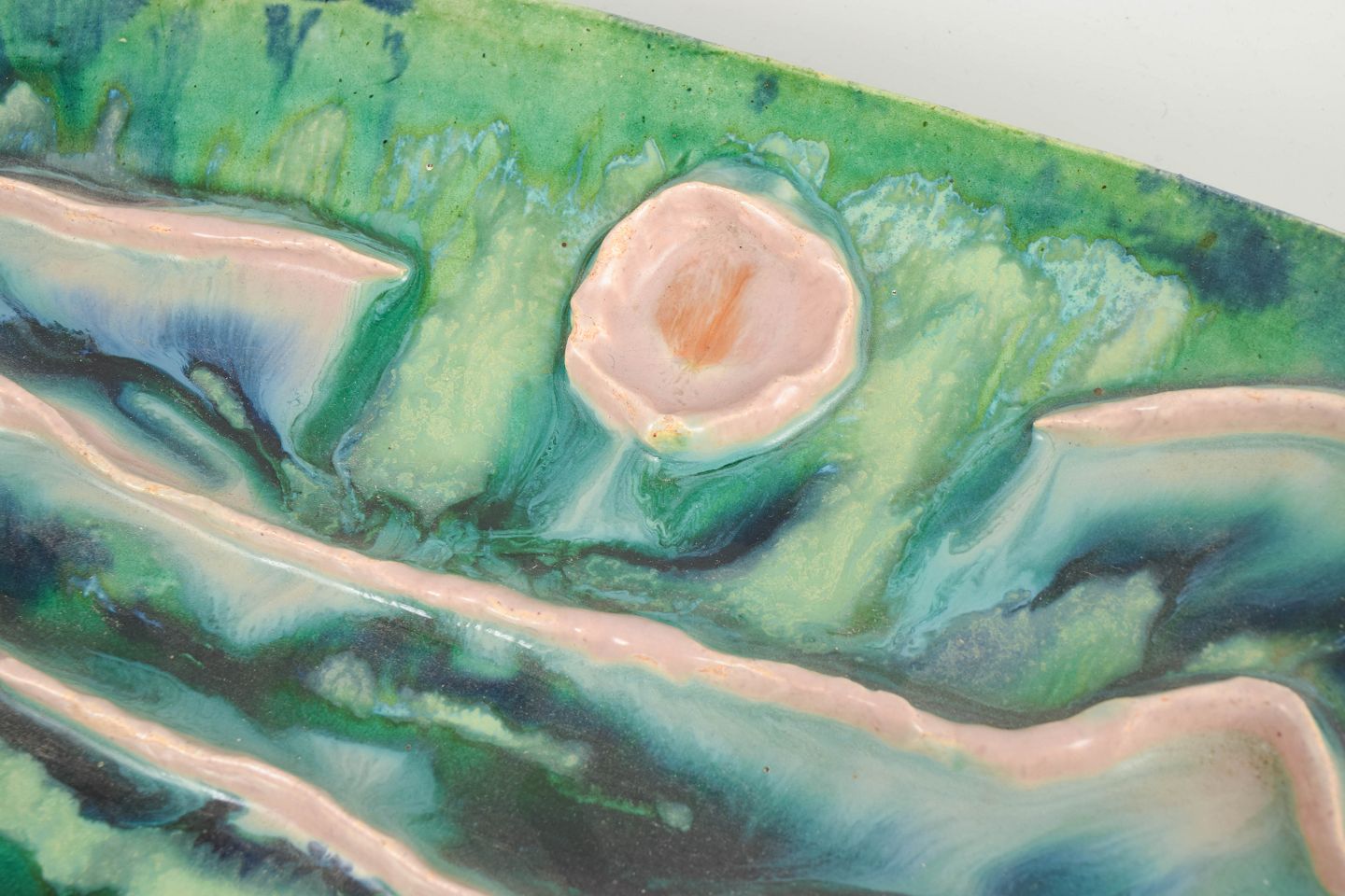 Leszek Dutka (1921-2014) Organisk relief, 1972. Signeret.Unikt, væghængt keramisk relief udført i organiske former med markant reliefvirkning. Overfladen er rigt modelleret med bølgende linjer og forhøjede partier, dekoreret med levende glasurer i grønne og blå nuancer, kontrasteret af bløde, lyserøde reliefelementer. Et ekspressivt og sanseligt værk, der tydeligt afspejler 1970’ernes eksperimenterende keramiske udtryk.