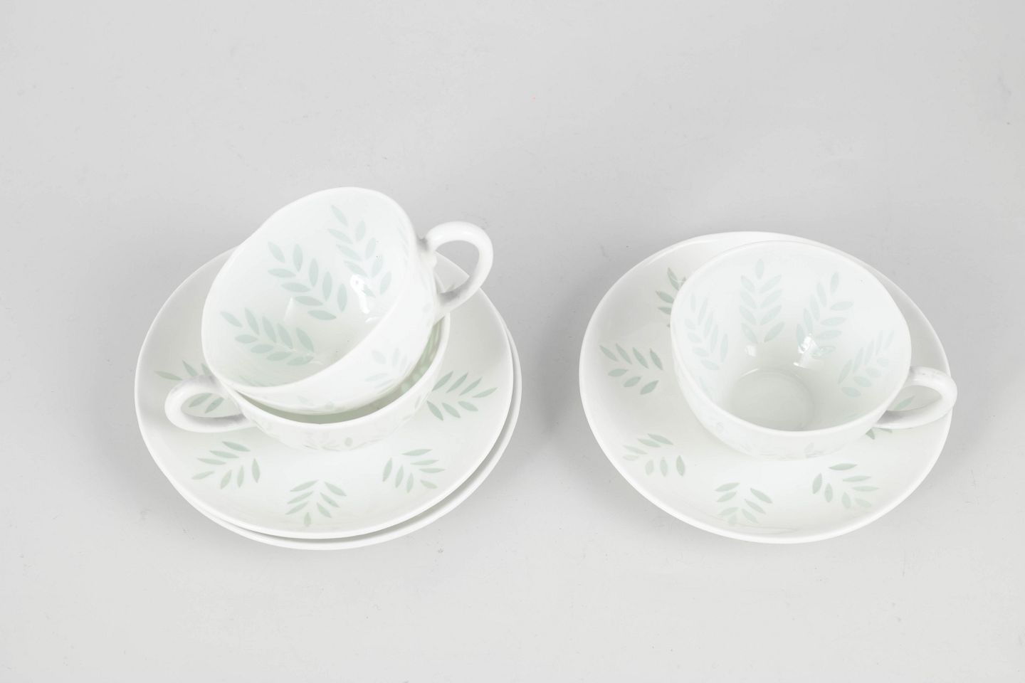 Elegant set consisting of three mocha cups with matching saucers in white porcelain, decorated with subtle leaf ornamentation executed in transparent, lightly green-tinted glaze fields. The light and refined expression combined with soft forms is characteristic of Friedl Holzer-Kjellberg’s late porcelain production for Arabia.