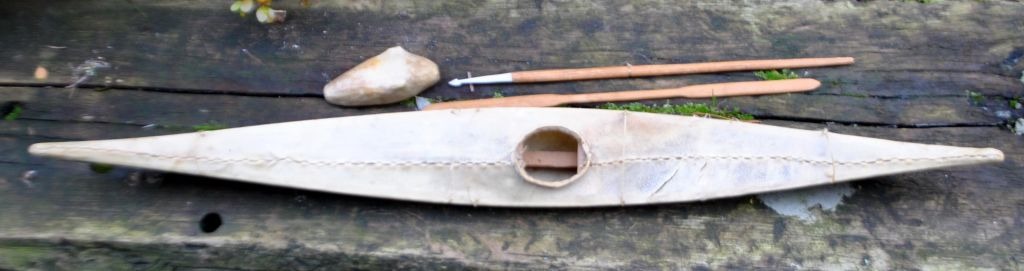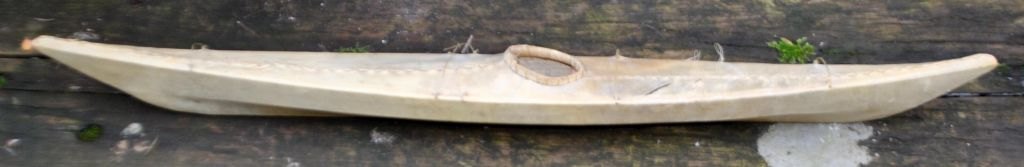 Large Greenlandic kayak, 20th century. Seal skin over wooden frame. Includes oar, spear and bladder. L.: 70 cm.Item number: 28781