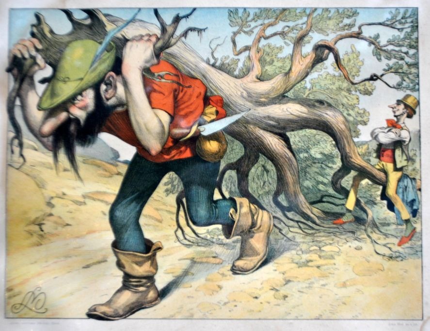 Moe, Louis (1877 - 1945) Danmark: Kompostion med mand, der bærer et træ. Farvelitografi. Signeret i trykket. Udgivet af Alfred Jacobsen, København. 27,5 x 36 cm.Indrammet: 41 x 49 cm.