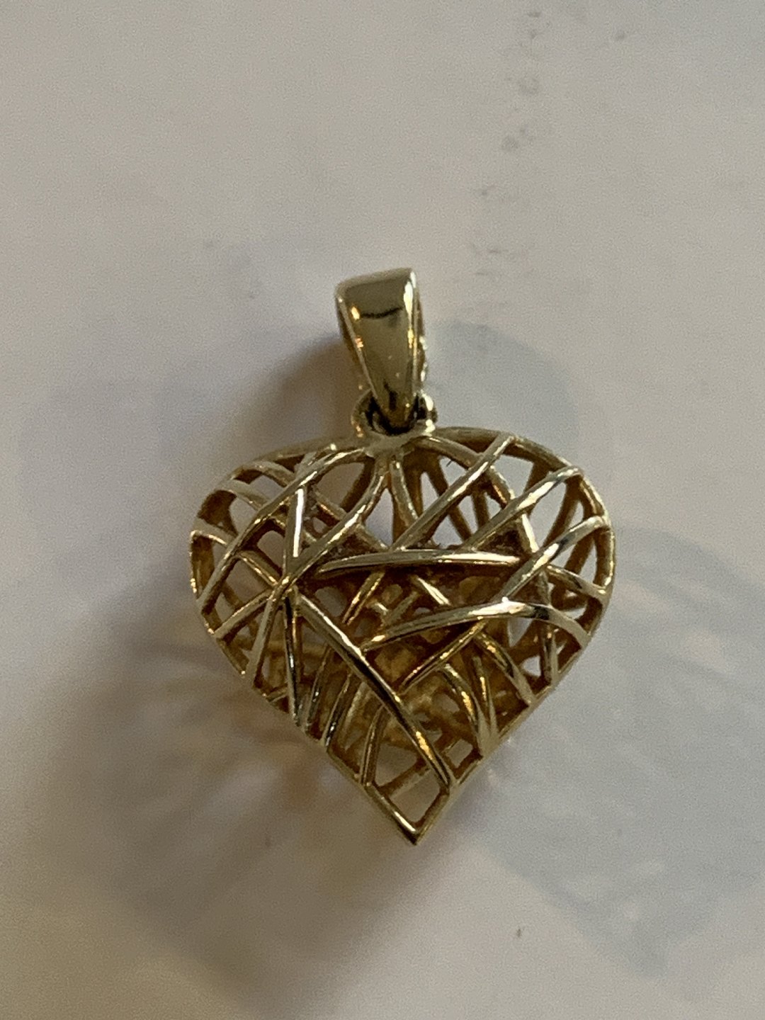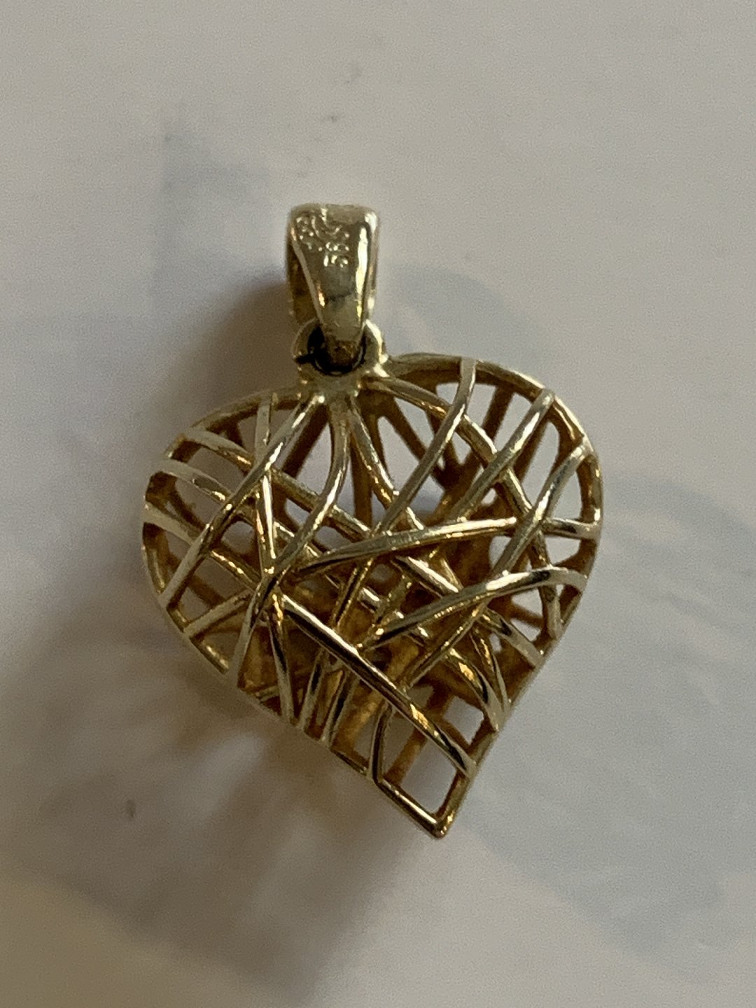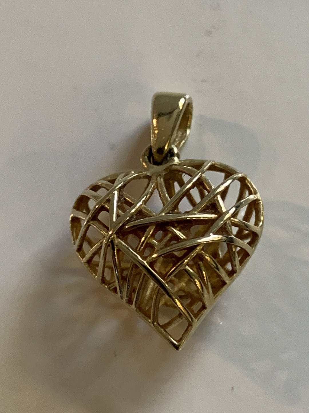 Dette hjerteformede vedhæng er lavet i anderledes stil, som om det er vævet af guldtråde. Det giver vedhænget et luftigt og levende udseende, der vil være et perfekt match med en tynd guldkæde. Designet af vedhænget, får det til at ligne et svulmende hjerte. Et flot vedhæng især til den unge pige.Bredde: 19,24 mm.