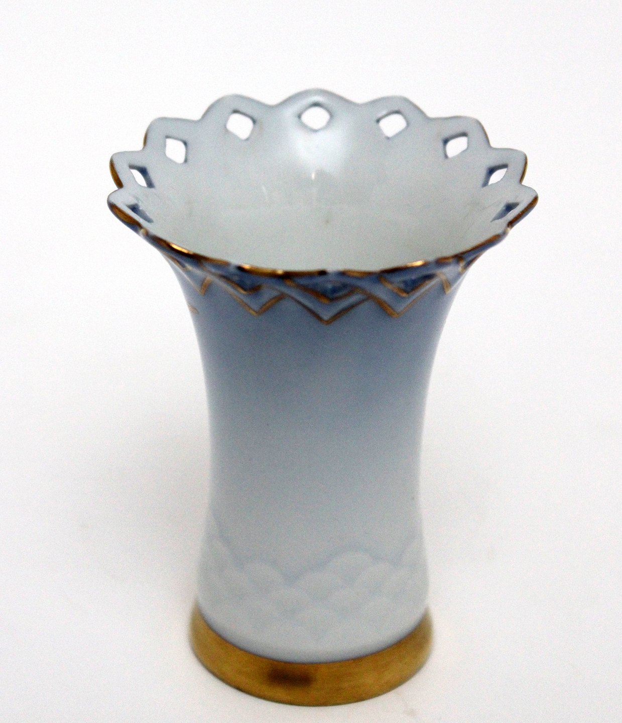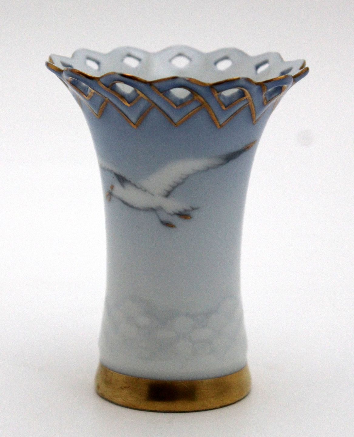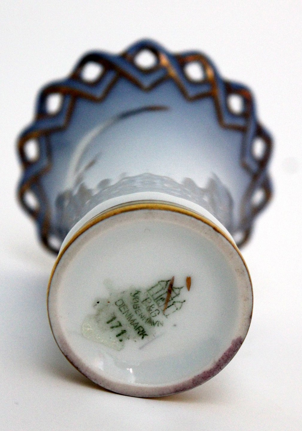 Bing & Grøndahl, Måge med guld, Kuvertvase med hulkant. Nr. 171. Højde 7,5 cm. Øverste diameter 6 cm. I. sortering. Pris: 175 kr. stk. Lager: 1 Udstiller
