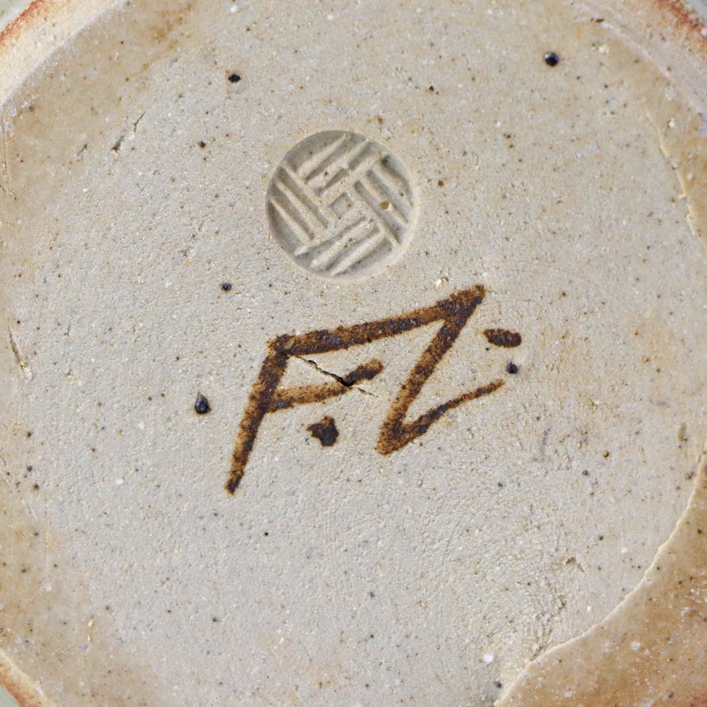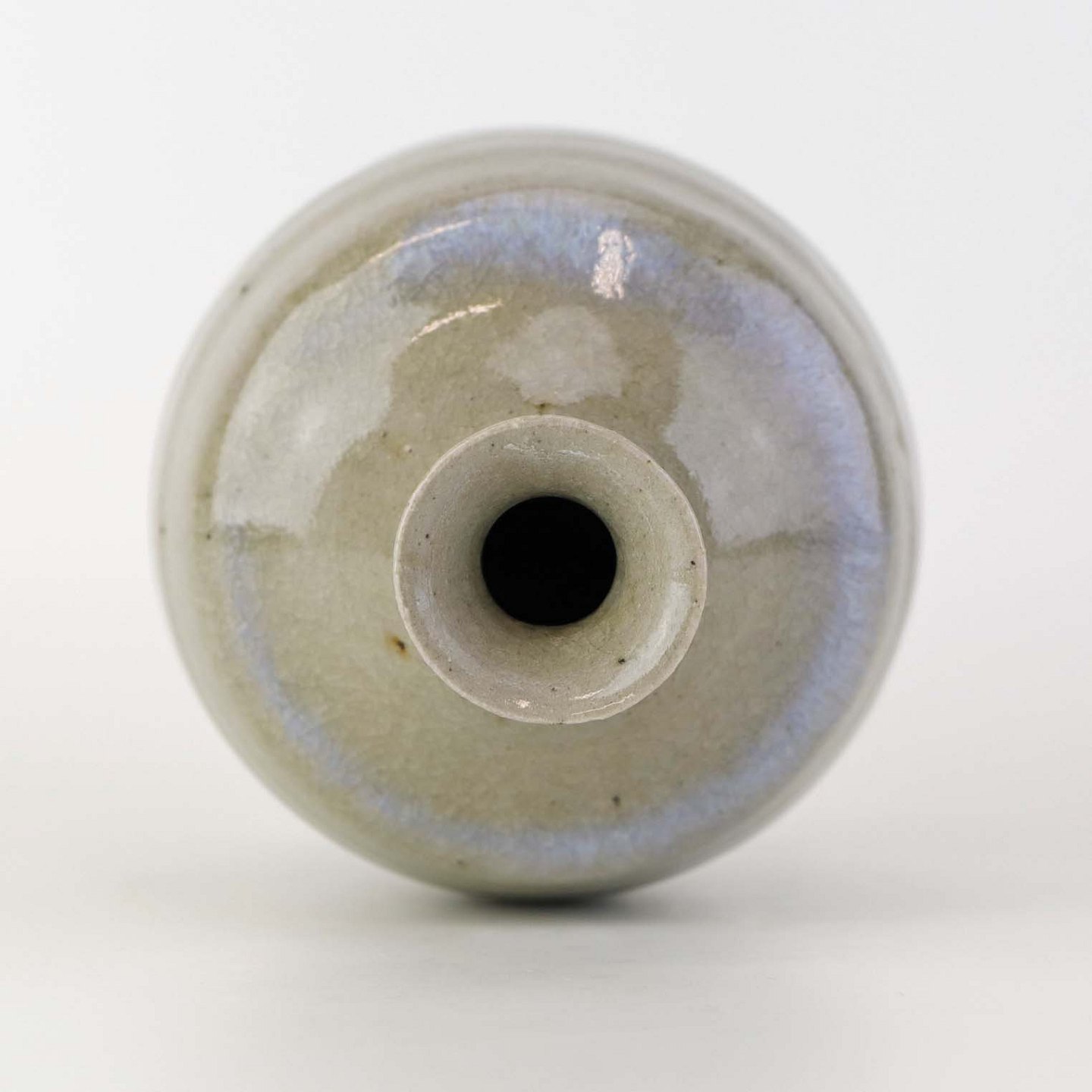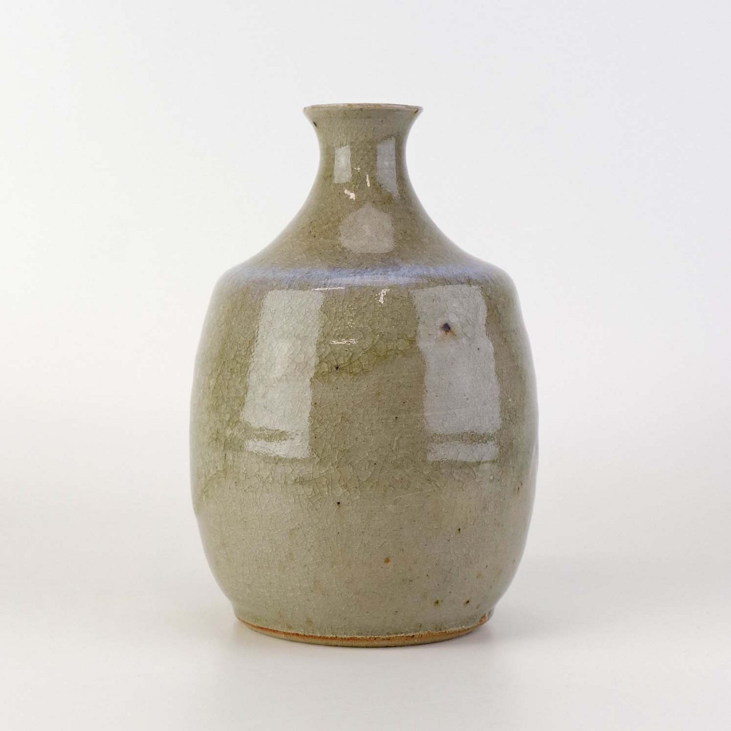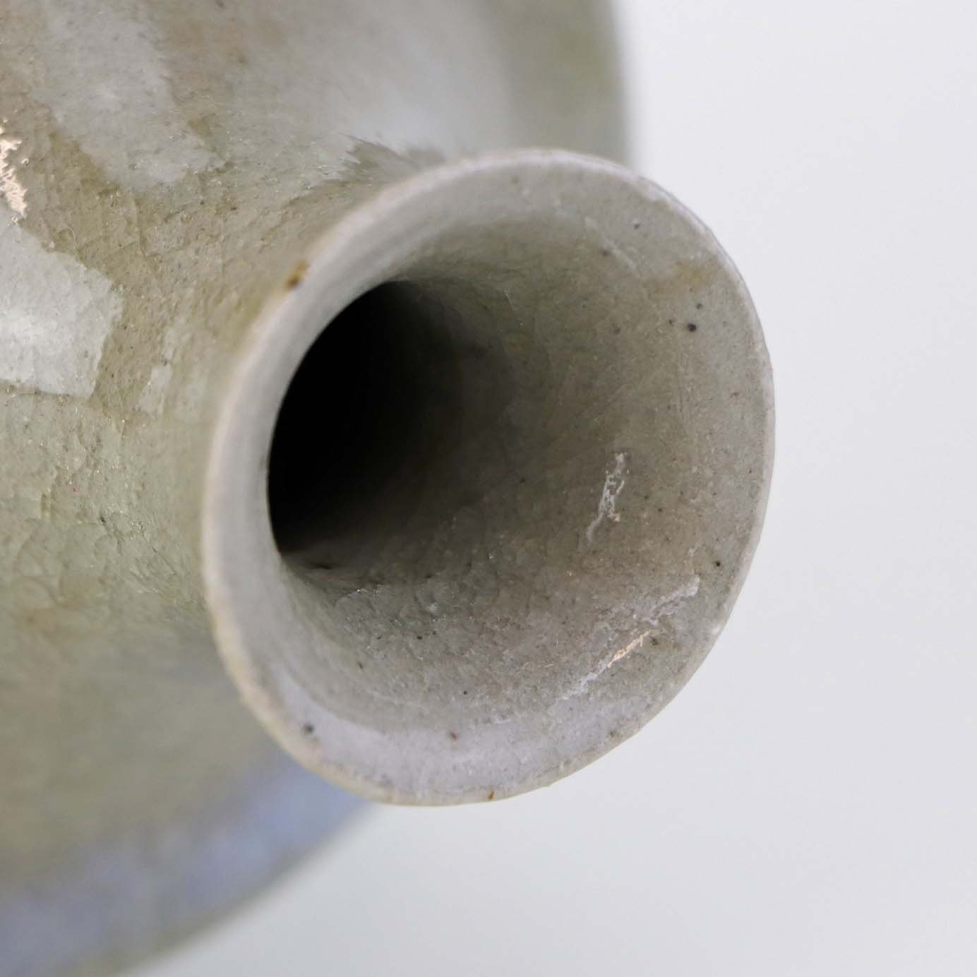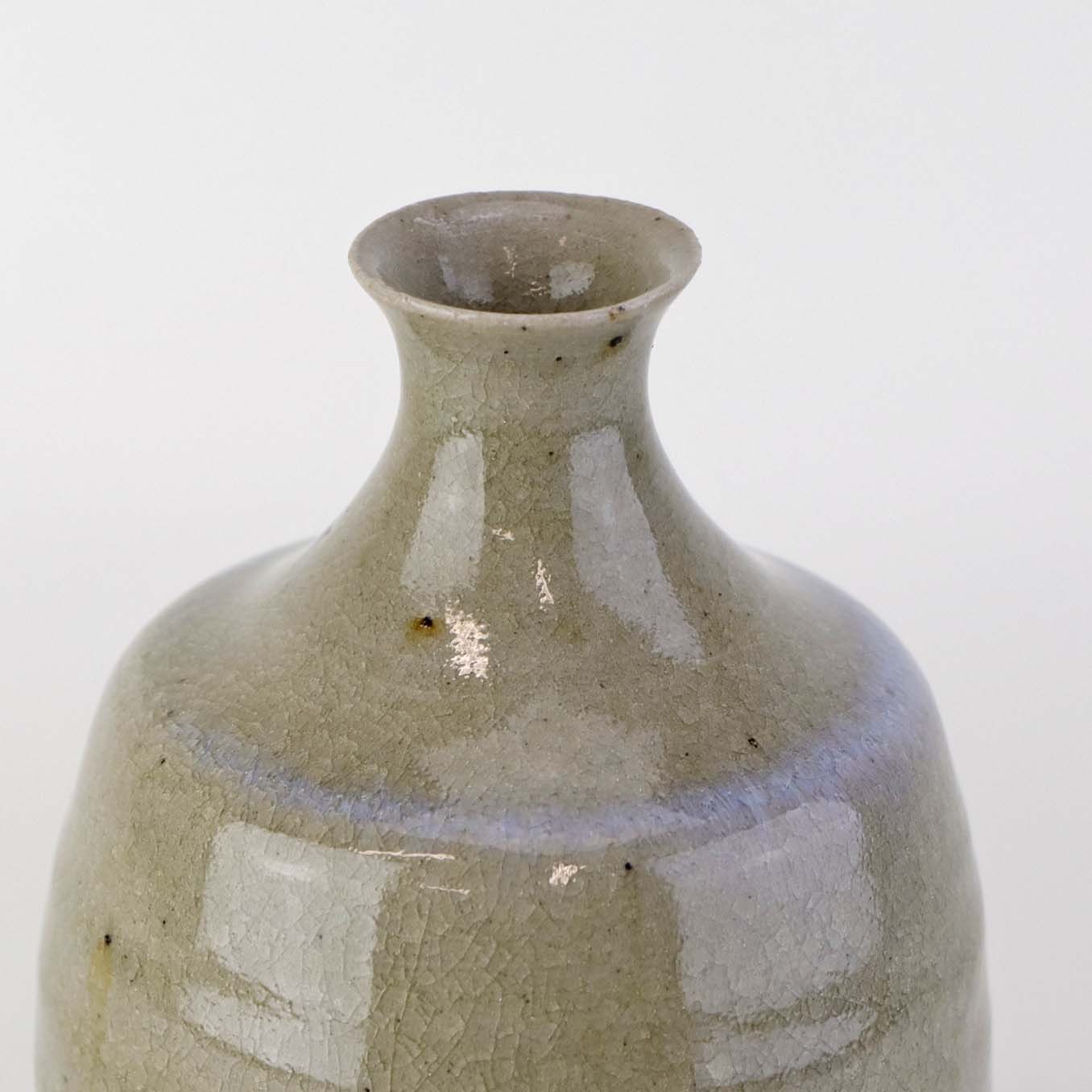 Vase i stentøj med beigefarvet glasur med mørke nister og krakkeleringer samt med en fremhævet blå kant.Producent Finn Lynggaard