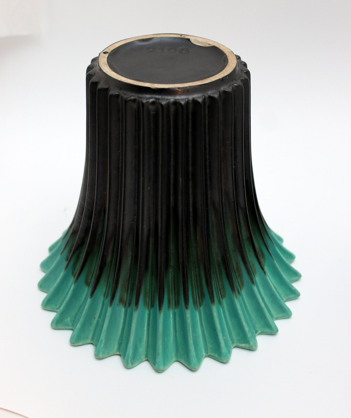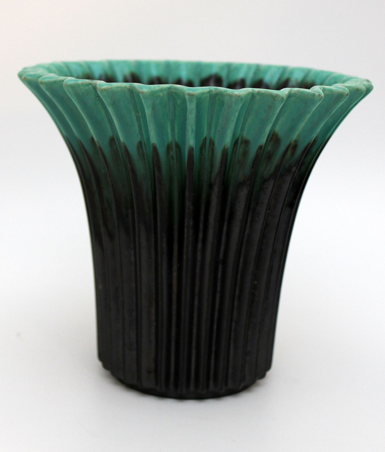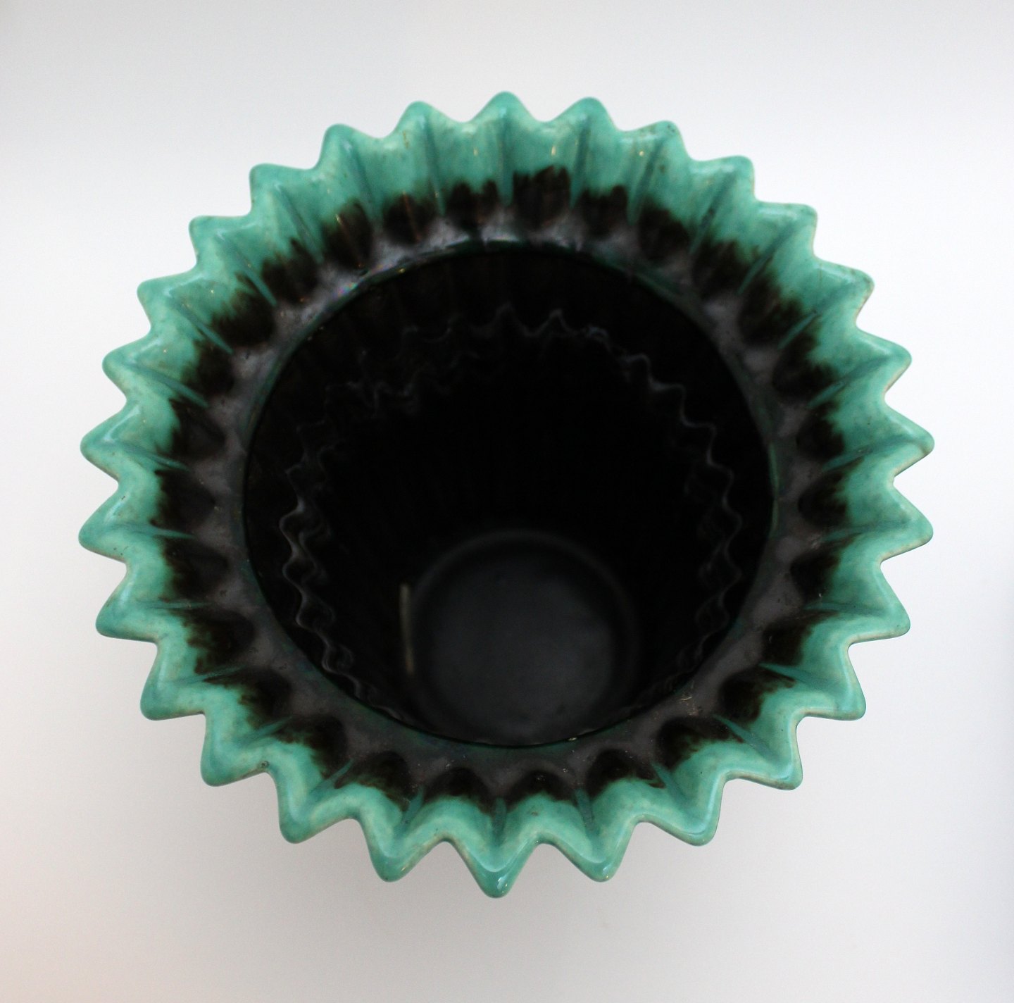 Sort rillet keramik vase med turkis kant. Nr. 2198. Kender ikke keramikeren eller fabrikken. Men vasen er meget dekorativ og anvendelig. Fin stand, bred kalkagtig rand indvendig. Højde 17,5 cm. Øverste diameter 19,5 cm. Nederste diameter 10 cm. Pris: 375 kr. Lager: 1 Udstiller