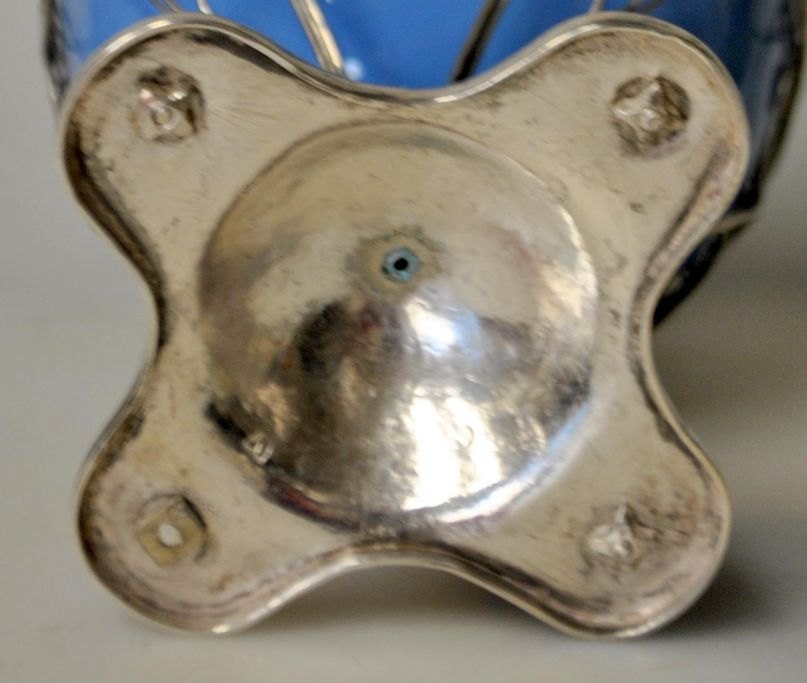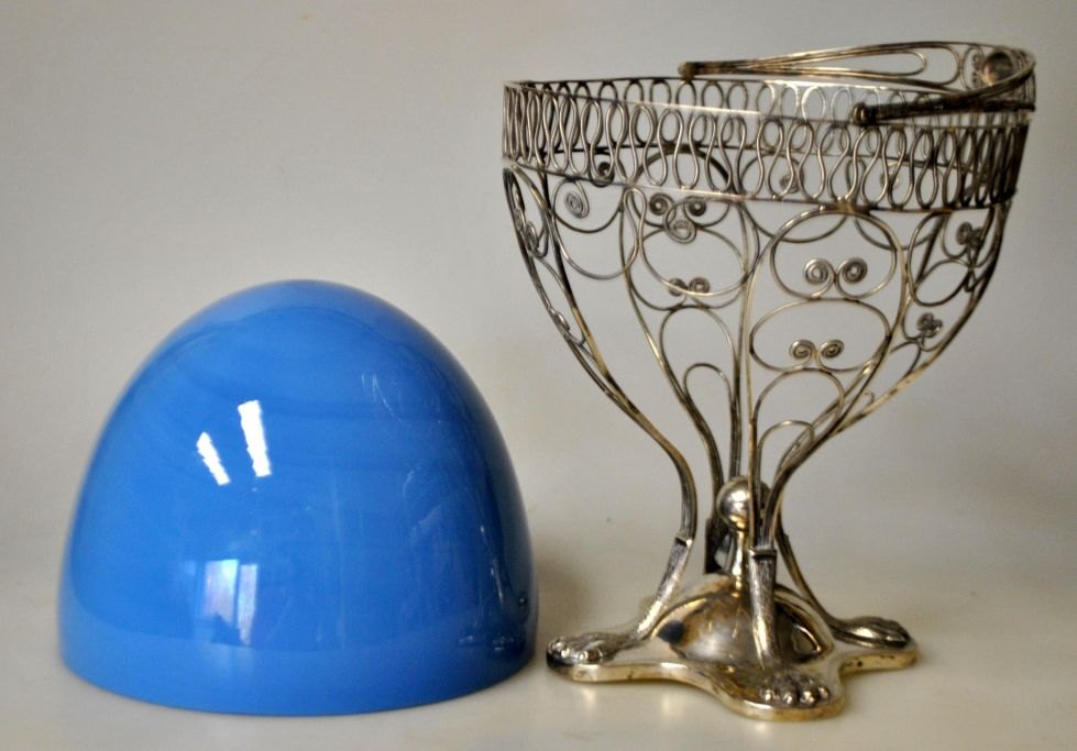 Jacob Wilhelm Ryder (1787 - 1853) København, Danmark: Stor sukker kumme. 18.. Empire. Med lysblåt glas indsats. Med hank. Filigranarbejde. Stemplet med mestermærke, byvåben, guardein mærke og månedmærke. H.. 16 cm. Højde med hank: 21,5 cm. Vægt sølv: 158 gram.Emne nummer: 28670