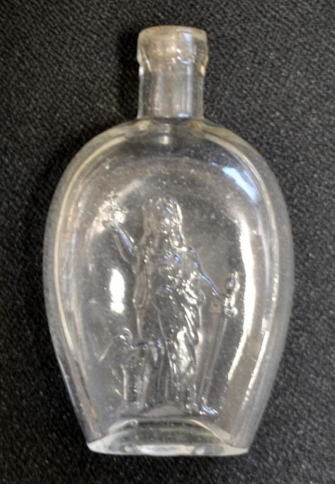 Tysk lommelærke i klart glas med motiv af Germania, 19. årh. Klar glas. Præget i bunden med "1/8 L". L: 12 cm.Emne nummer: 28681