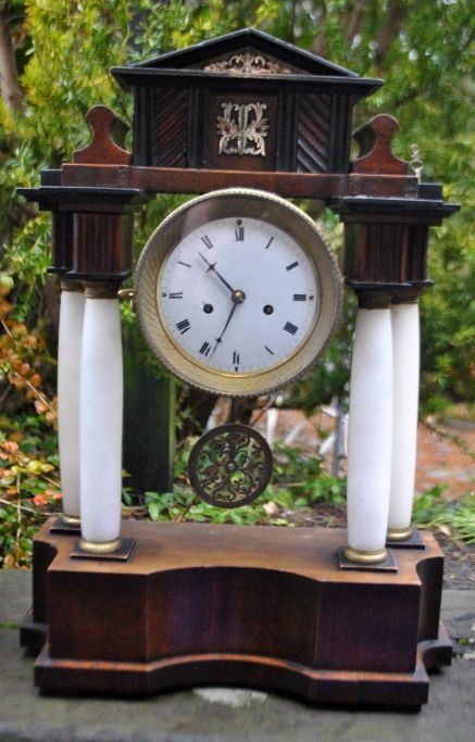 Søjleur i træ, messing og alabast, ca. 1830. Antageligt sydtysk eller østrisk. Mahogni plint og top. Skive i emalje med arabertal. Standart urværk. Urvisere i bronze. H: 45 cm. B: 32 cm.Med to optræksnøgler.