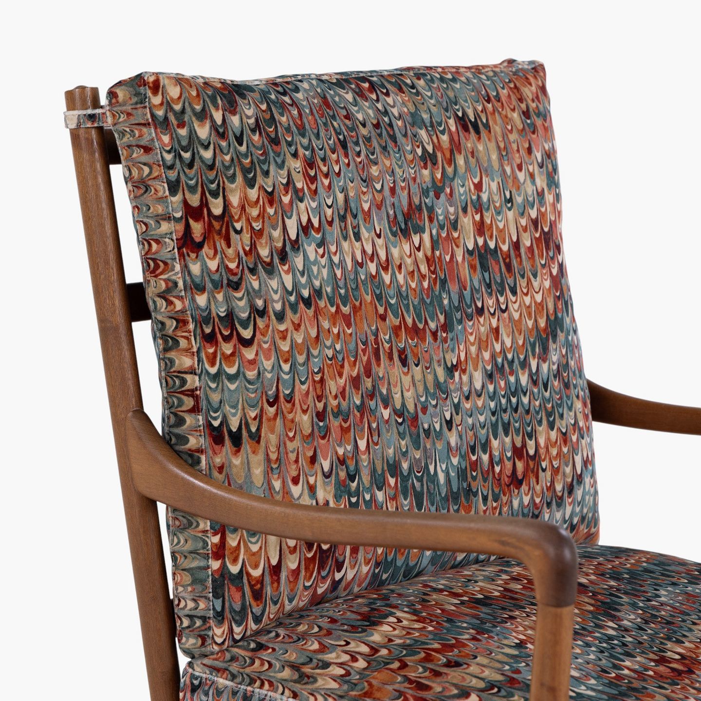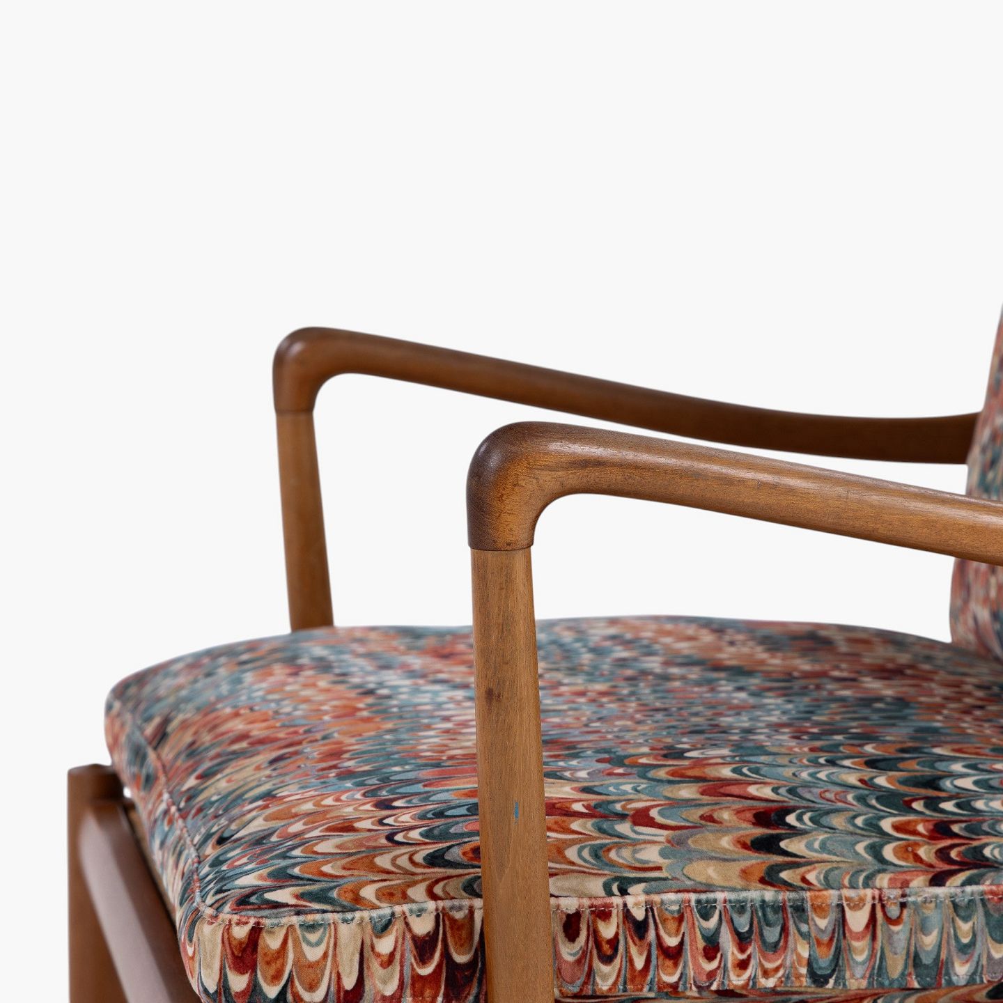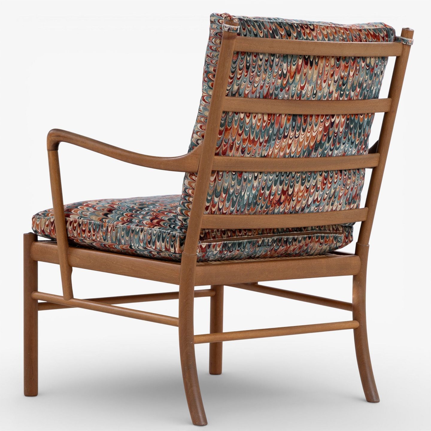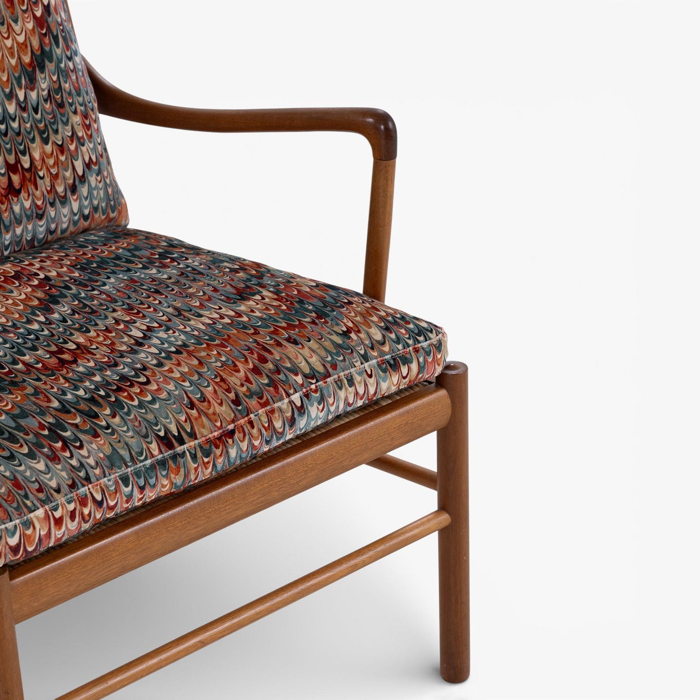PJ 149 - 'Colonial Chair'-lænestol i patineret mahogni med nybetrukkede hynder i 'End Paper Velvet'-tekstil. Mærket fra producent.