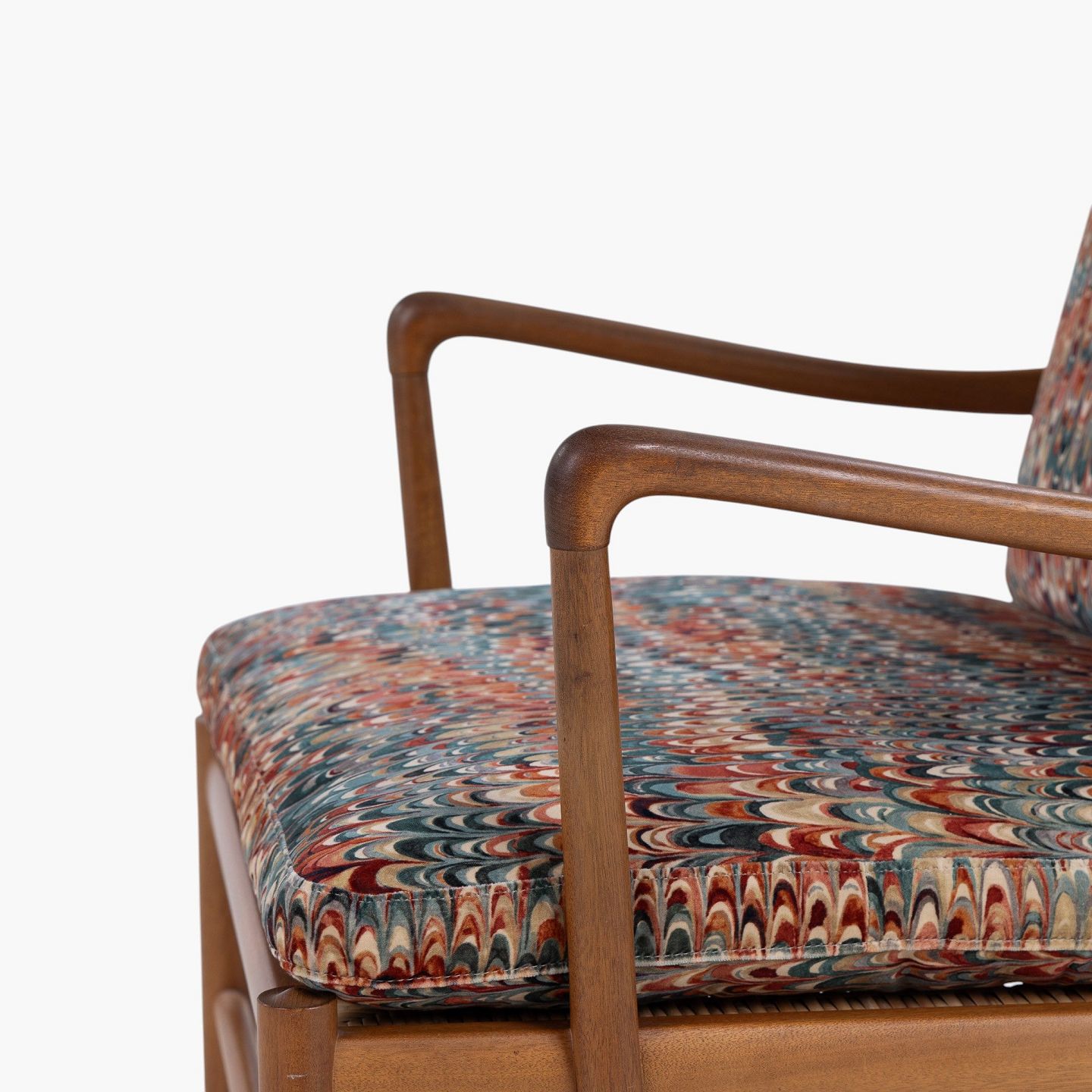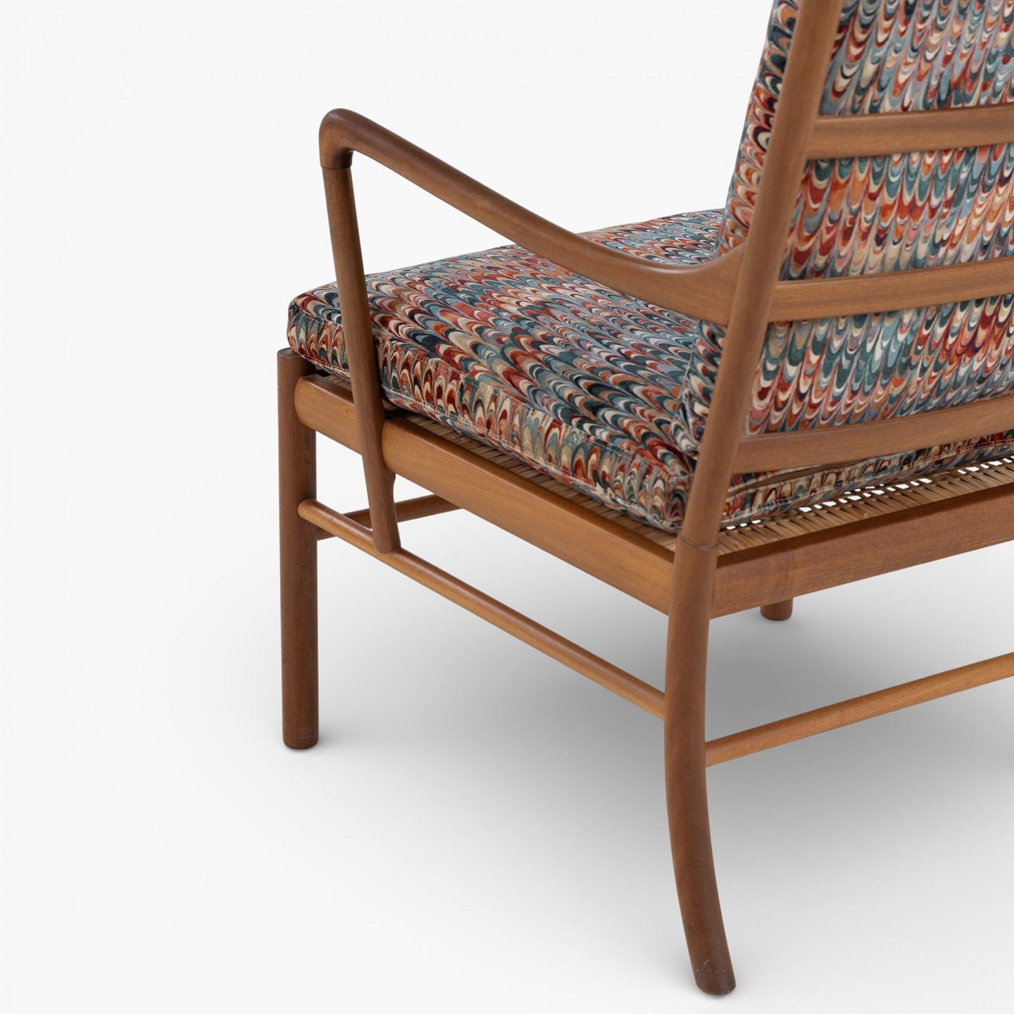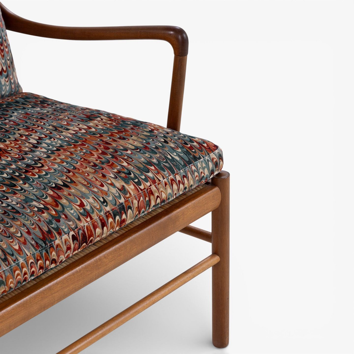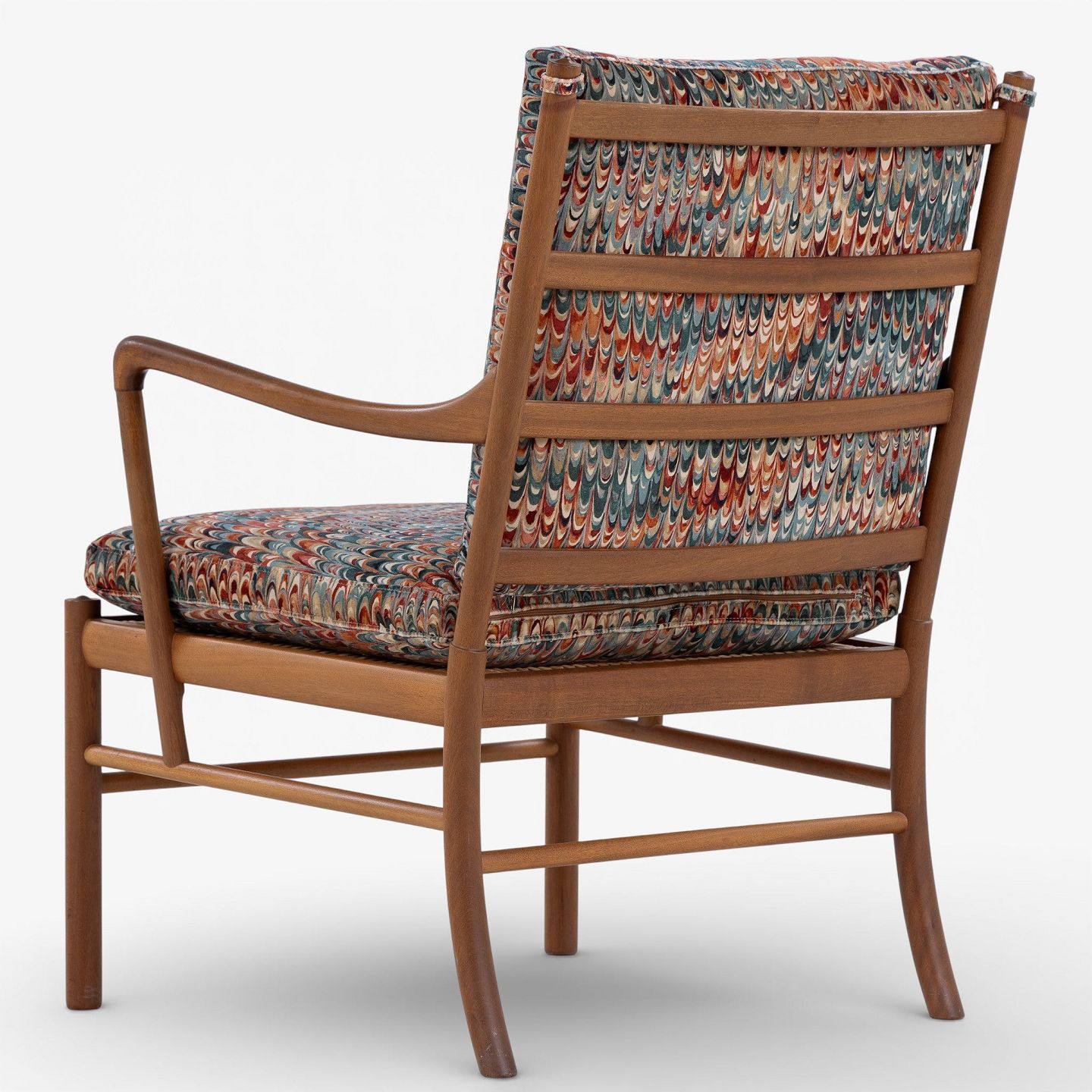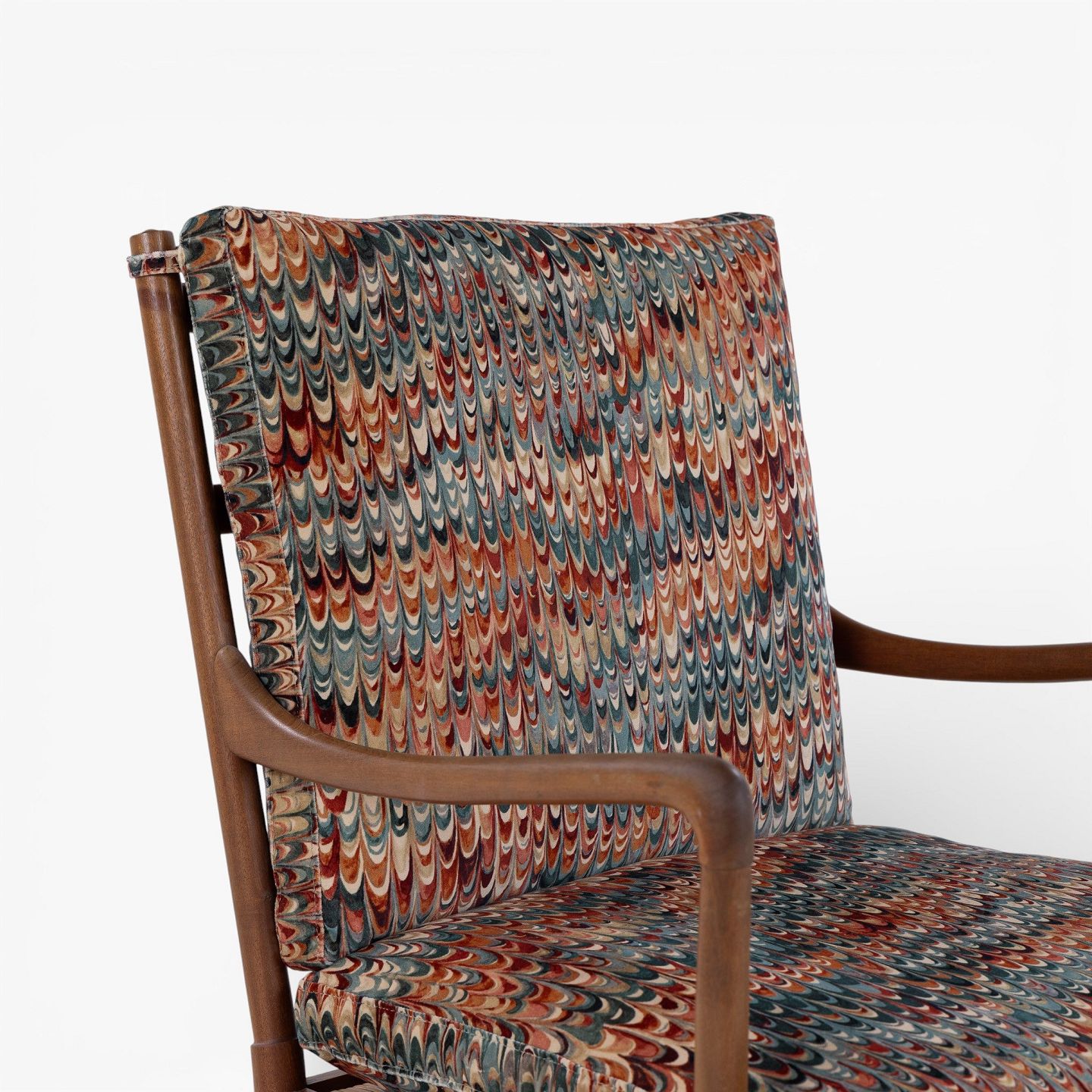 PJ 149 - 'Colonial Chair'-lænestol i patineret mahogni med nybetrukkede hynder i 'End Paper Velvet'-tekstil. Mærket fra producent.