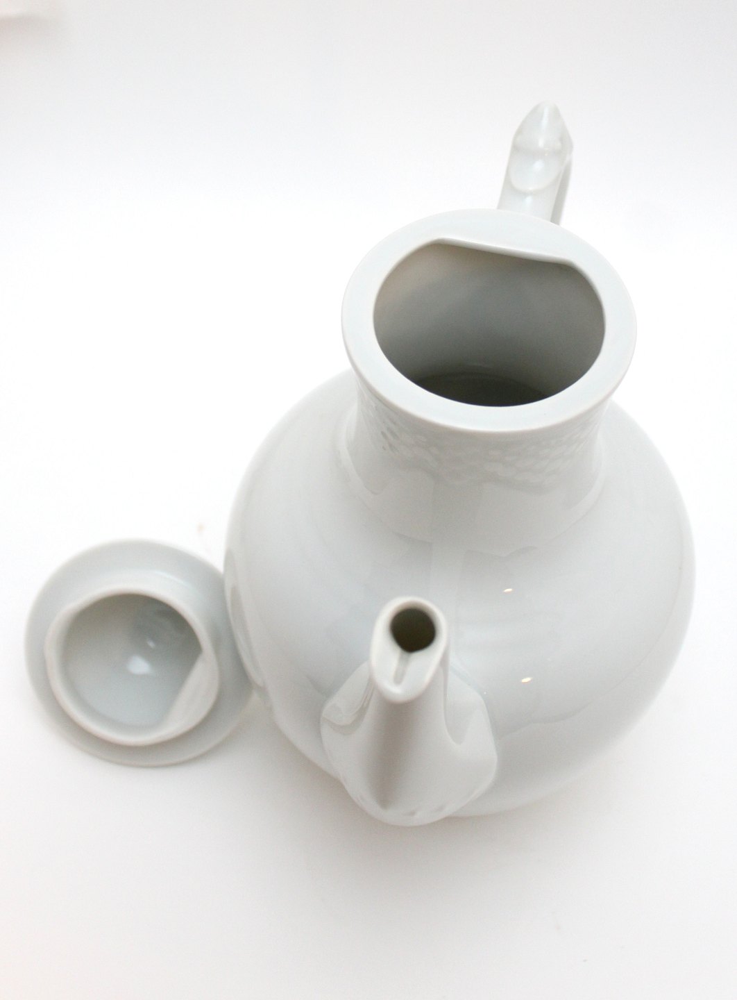 Bing & Grøndahl, Elegance. Kaffekande med låg. Hvidt grundstel med vaflet mønster og søheste. Nr. 91A. Produceret i perioden 1962-1970. Højde 25 cm. Største diameter 12 cm. II. sortering. Fin stand. Pris: 225 kr. stk. Lager: 1 Udstiller