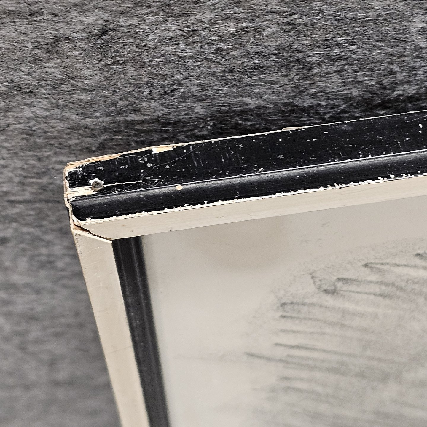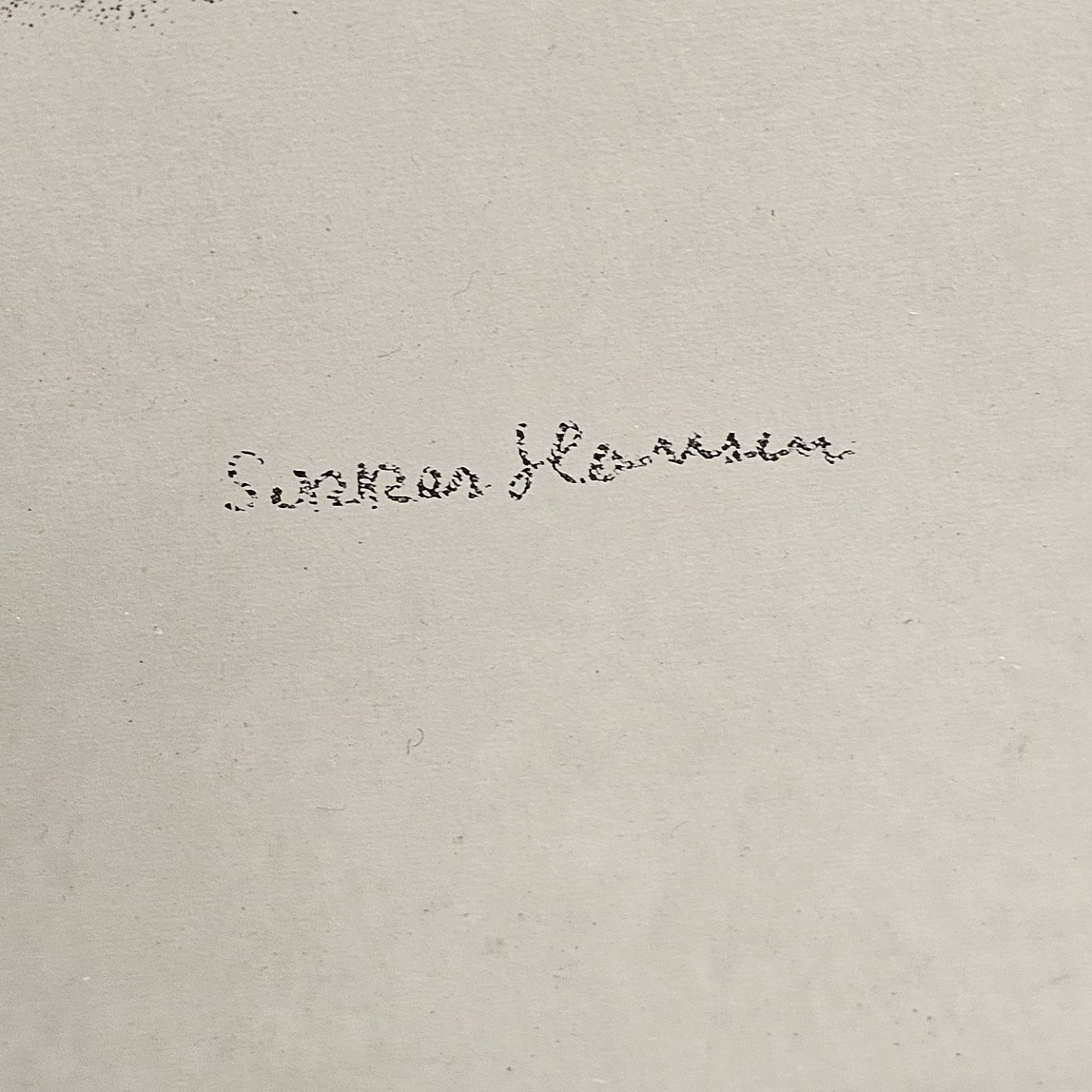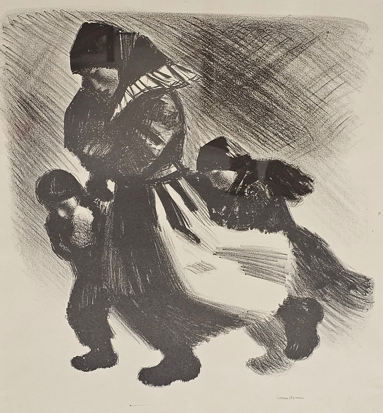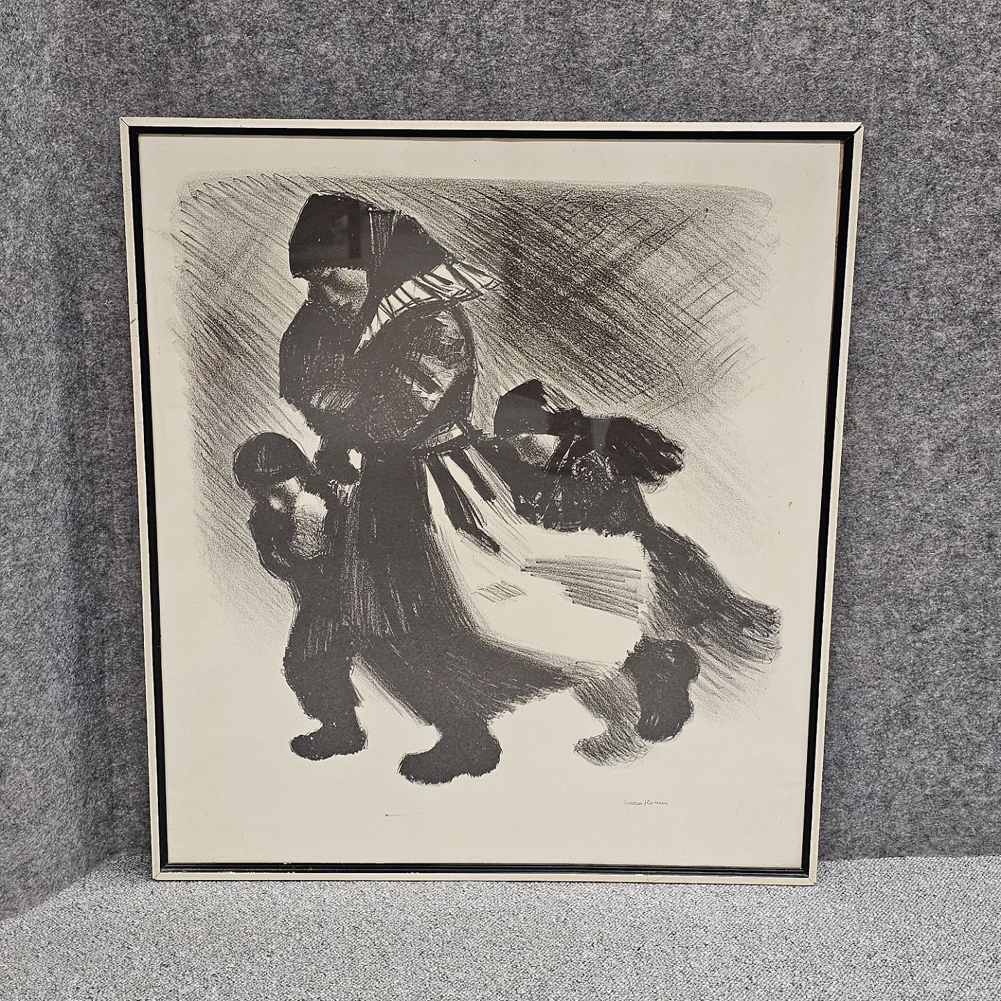Tryk på papir med motiv af en kvinde med tre børn monteret i sort og hvid rammeKunstner Sikker Hansen