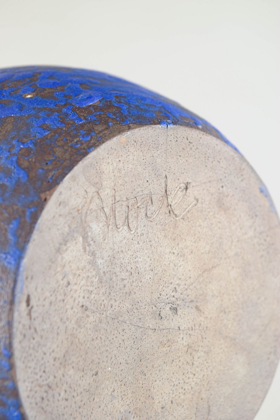Kraftfuld og balanceret vase udført i stentøj med dyb, blå glasur og levende overfladestruktur. Den let bugtede krop og den åbne munding giver et markant, skulpturelt udtryk.