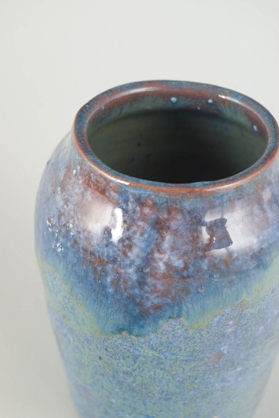 Elegant og balanceret vase udført i stentøj med blank, flerlaget glasur i blålige og grønlige nuancer med mørkere overgange ved halsen. Overfladen har et levende og dybdevirkende udtryk, karakteristisk for tidens eksperimenterende glasurteknikker.