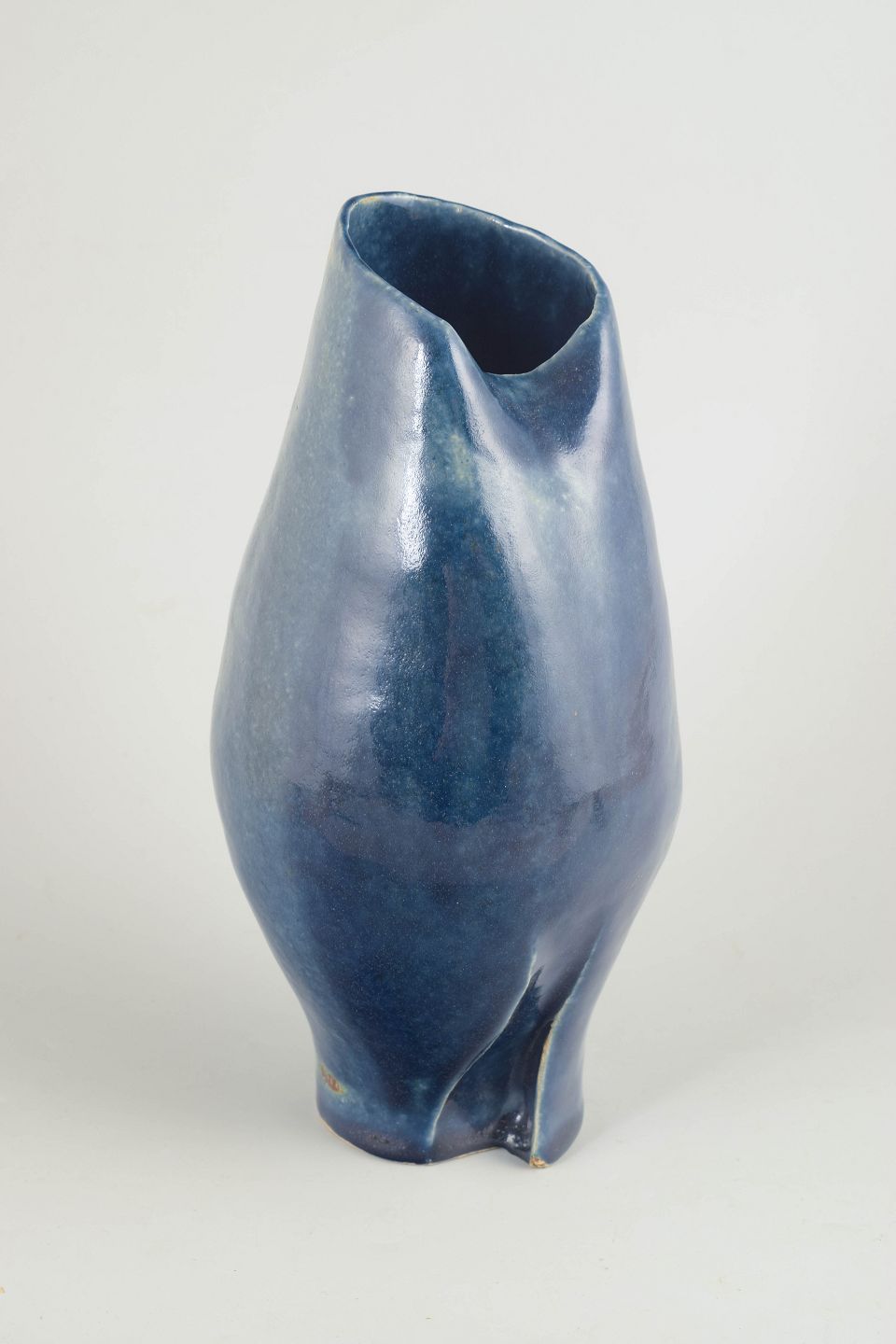 Europæisk studiokeramiker unik vase, 1987.Skulpturelt udformet vase i stentøj med dybblå, let levende glasur og organisk, asymmetrisk åbning. Signeret og dateret 1987.