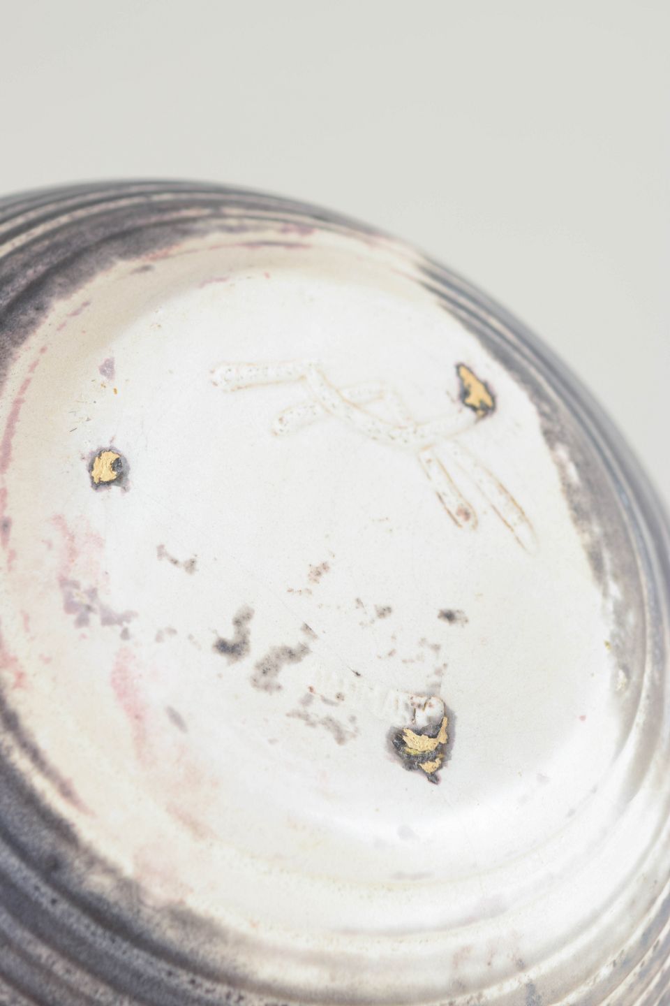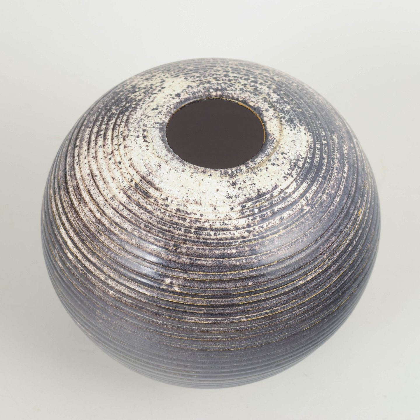 Svend Hammershøi for Kähler vase, 1930’erne.Kugleformet vase i drejet stentøj med karakteristisk rillet overflade og dobbelt glasur i sorte og grå nuancer, der skaber dybde og et nuanceret spil i overfladen.