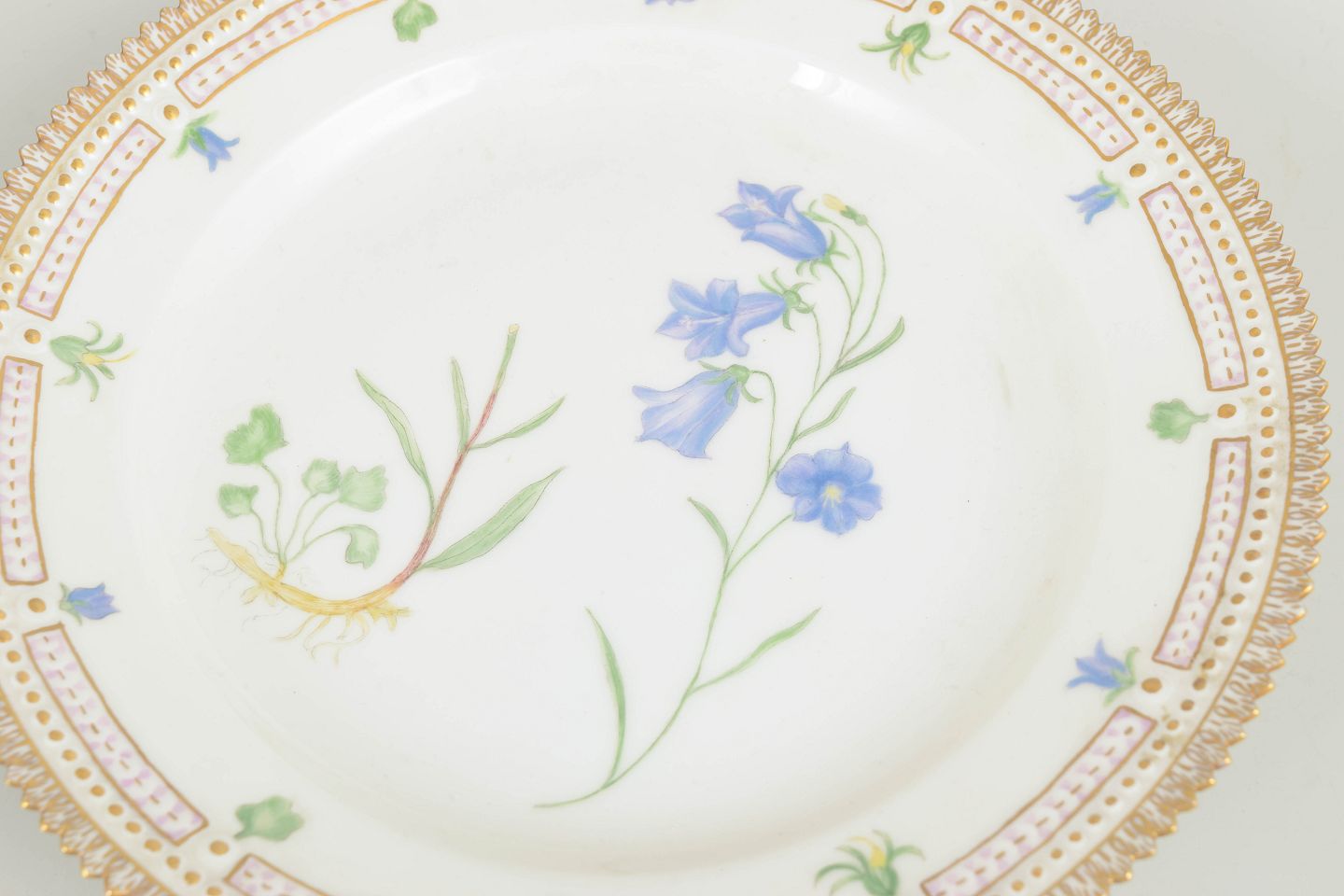Frokosttallerken i Flora Danica-stellet med håndmalet botanisk dekoration efter originalværker fra Flora Danica-værket. Klassisk form med rigt forgyldt rand.