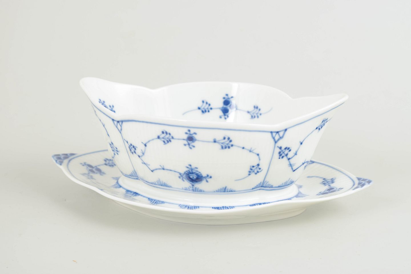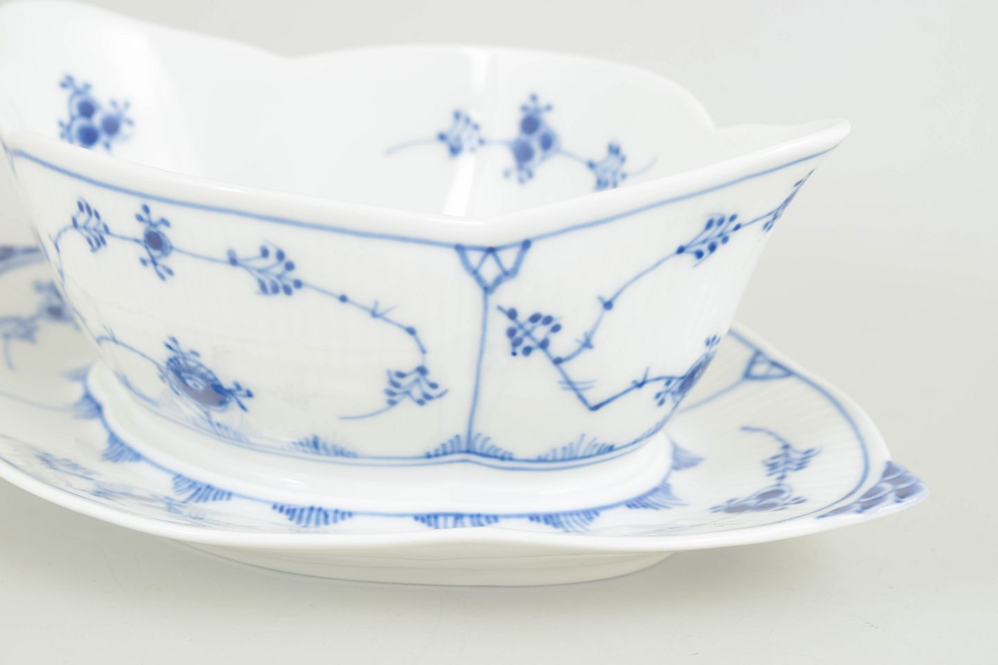 Musselmalet riflet, introduceret i 1775, er Royal Copenhagens ældste stel og et hovedværk i dansk porcelænshistorie. Stellet har været i kontinuerlig produktion gennem århundreder og er kendetegnet ved sin håndmalede underglasurdekoration og riflede form. Saucebåde som denne viderefører de klassiske former og funktioner i en moderne produktion fra midten af det 20. århundrede.