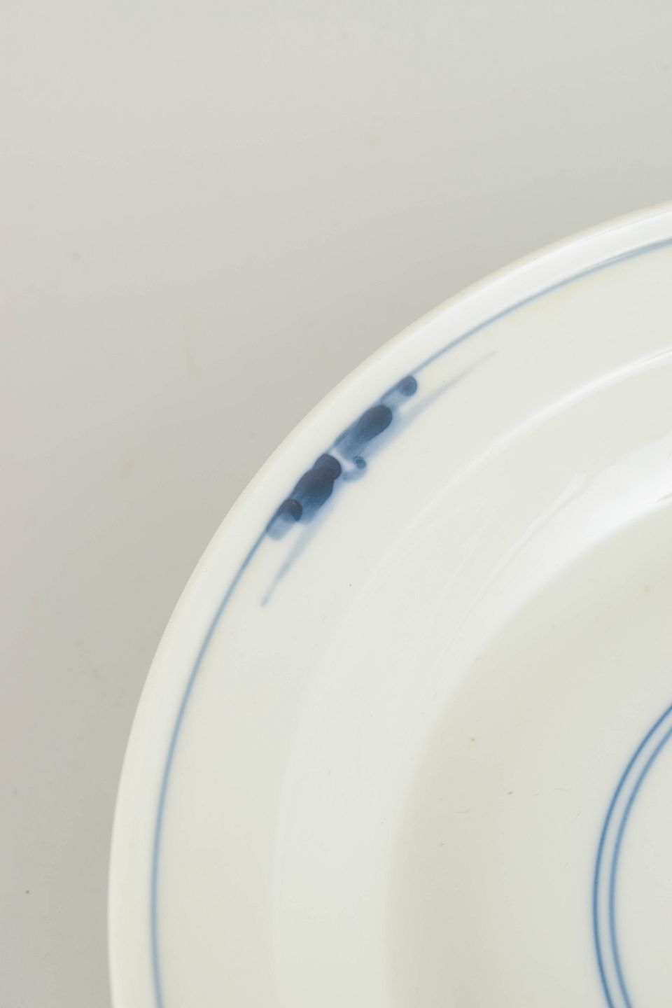 Gertrud Vasegaard for Royal Copenhagen Gemina dybe tallerkener, sæt af 3, 1962.Sæt bestående af tre dybe tallerkener i Gemina-stellet, udført i hvidt porcelæn med diskret, grafisk dekoration i blå underglasur. En stram og moderne formgivning, der er karakteristisk for Royal Copenhagens produktion i 1960’erne.