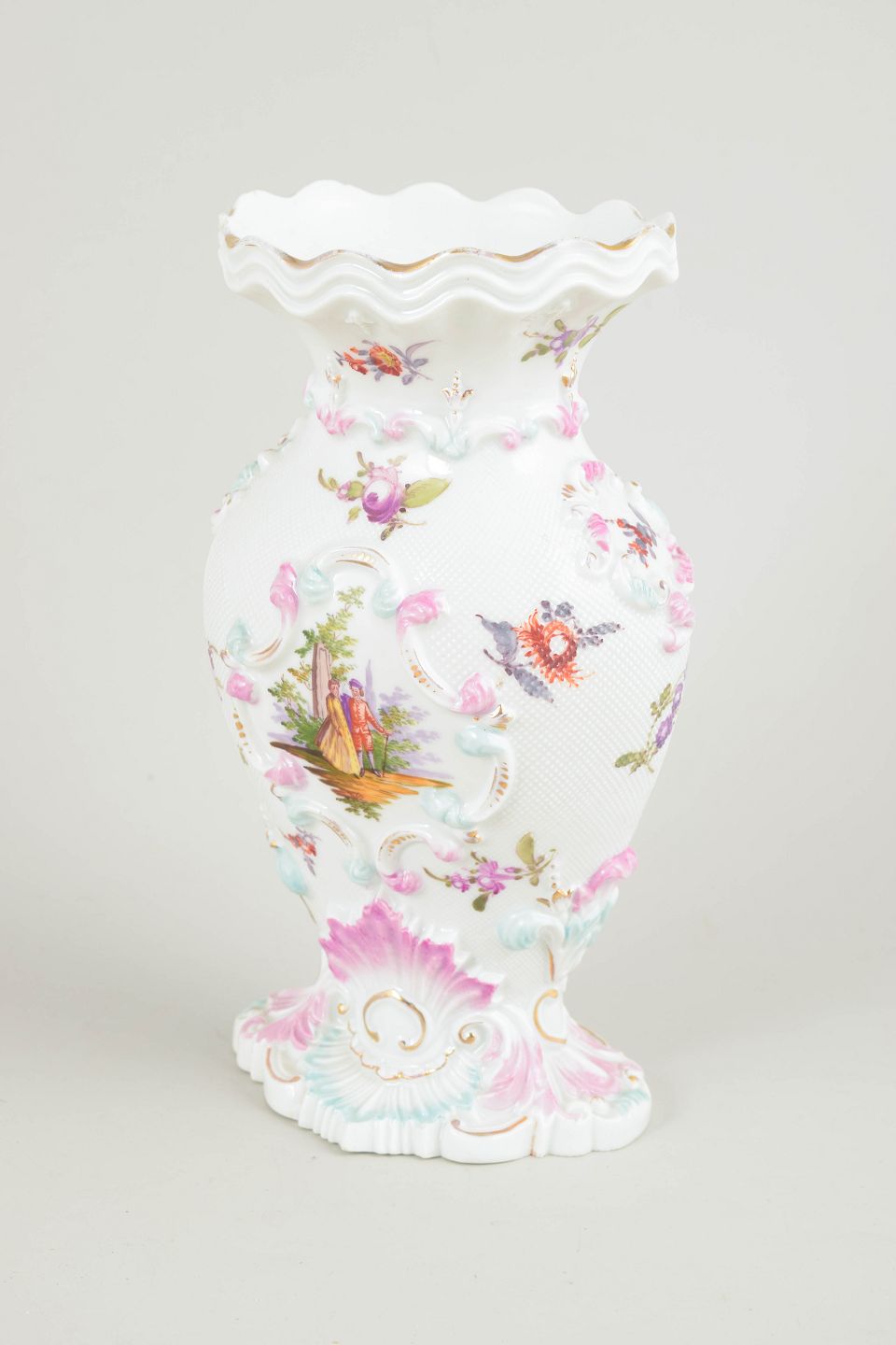 Meissen vase, tidligt 1800-tal.Sjælden vase i hvidt porcelæn rigt dekoreret i relief og med håndmalede polykrome blomster- og landskabsmotiver. Profileret fod og bølget munding. Et fint eksempel på Meissens dekorative porcelænskunst fra det tidlige 19. århundrede.