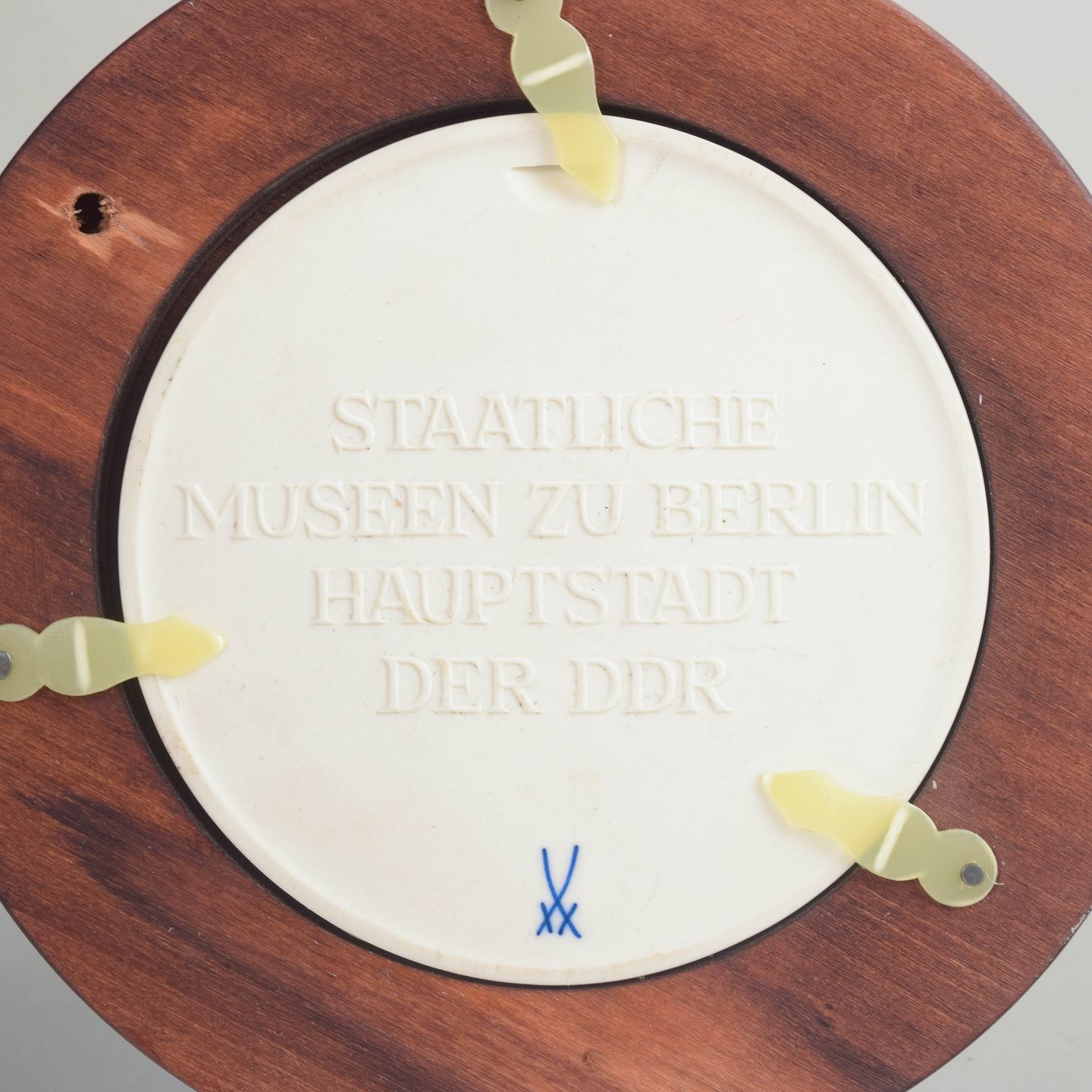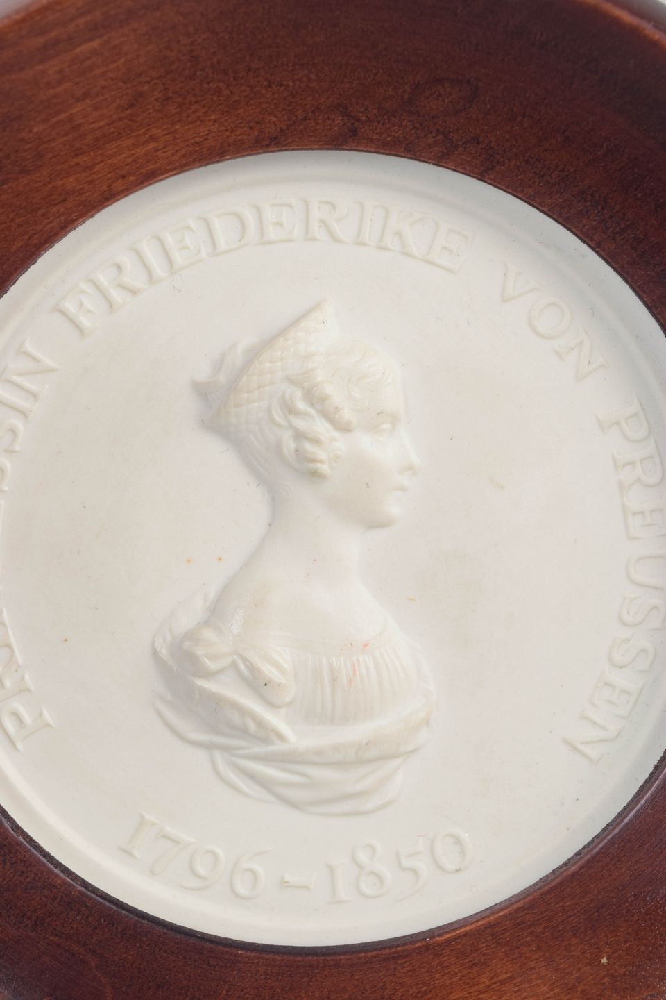 Meissen Biscuit plakette, ca. 1970’erne.Rund reliefplakette i hvid biscuit porcelæn med klassisk profilportræt og cirkulær indskrift, monteret i bred, rund træramme. Udført som en neoklassisk, medalje lignende komposition, hvor den matte biscuit overflade fremhæver de fine detaljer i portrættet.