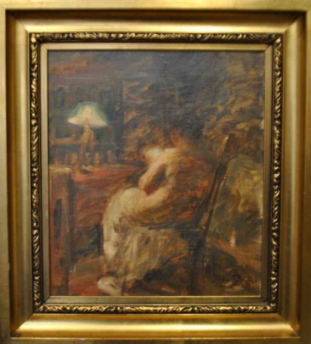 Paulsen, Julius (1860 - 1940) Denmark: Lamplight, interior. Oil on canvas. Signed. 38 x 33 cm.Framed: 54 x 45 cm. Framed in Kleis frame with corner wedges.