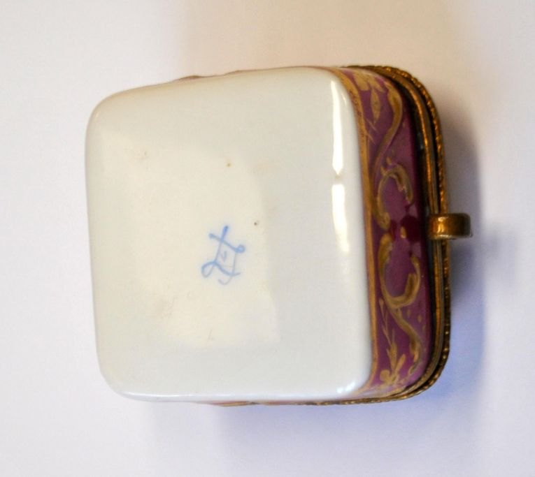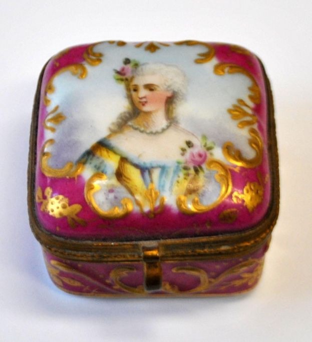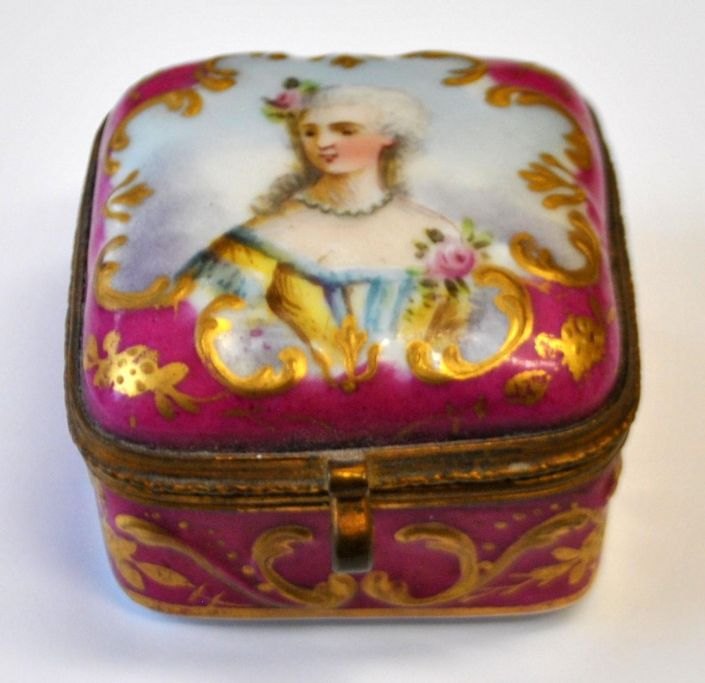 Sevres porcelain pill box, 19th century. France. Hand-painted porcelain with rococo woman. Light red with rococo gilding. Gilded inside. 4.5 x 4.5 x 3 cm. Perfect condition!Item number: 28719