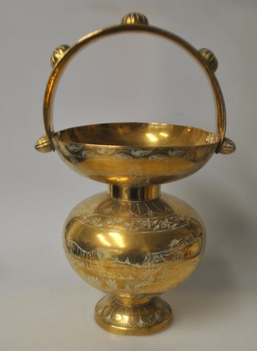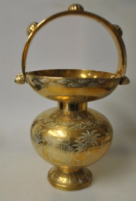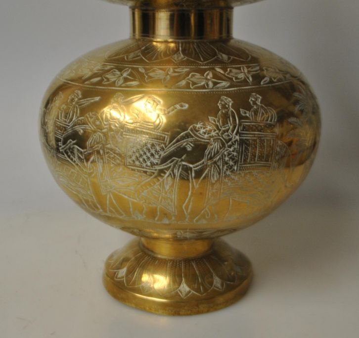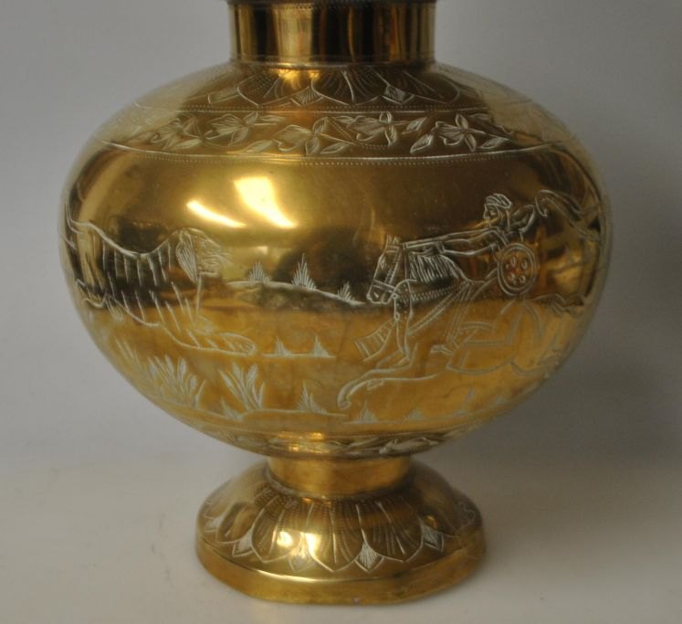 Stor indisk messing vase med hank, ca. 1950. Med indgraverede dekorationer af jagtselskab på elefanter på tiger jagt. På siden ses 4 tigre. Desuden indgraverede blomstermotiver. 32 cm. H.: 21 cm.Emne nummer: 28721