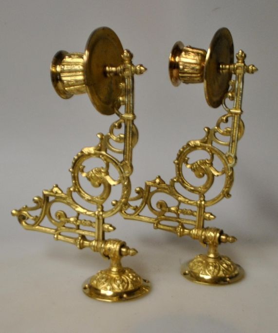 Par messing klaverstager, 19. årh. Med dekorationer af maskeroner. L: 19,5 cm.Perfekt stand. Fremstår nypudset!
